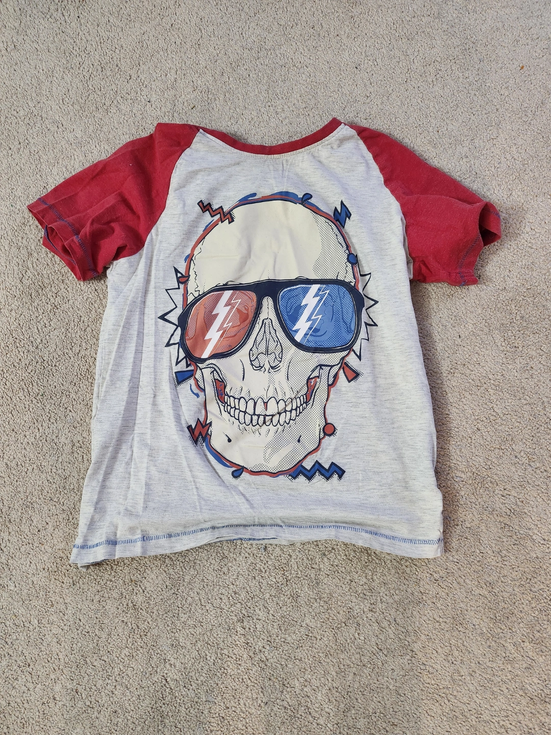 Grey and red raglan-style t-shirt. Features a graphic of a skull wearing sunglasses. Short sleeves. Size 10/12
