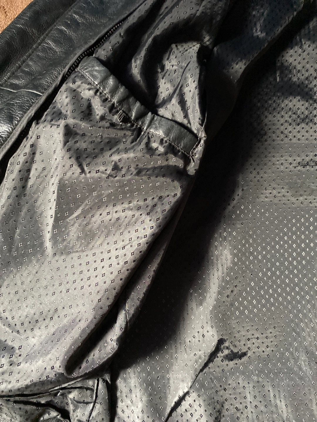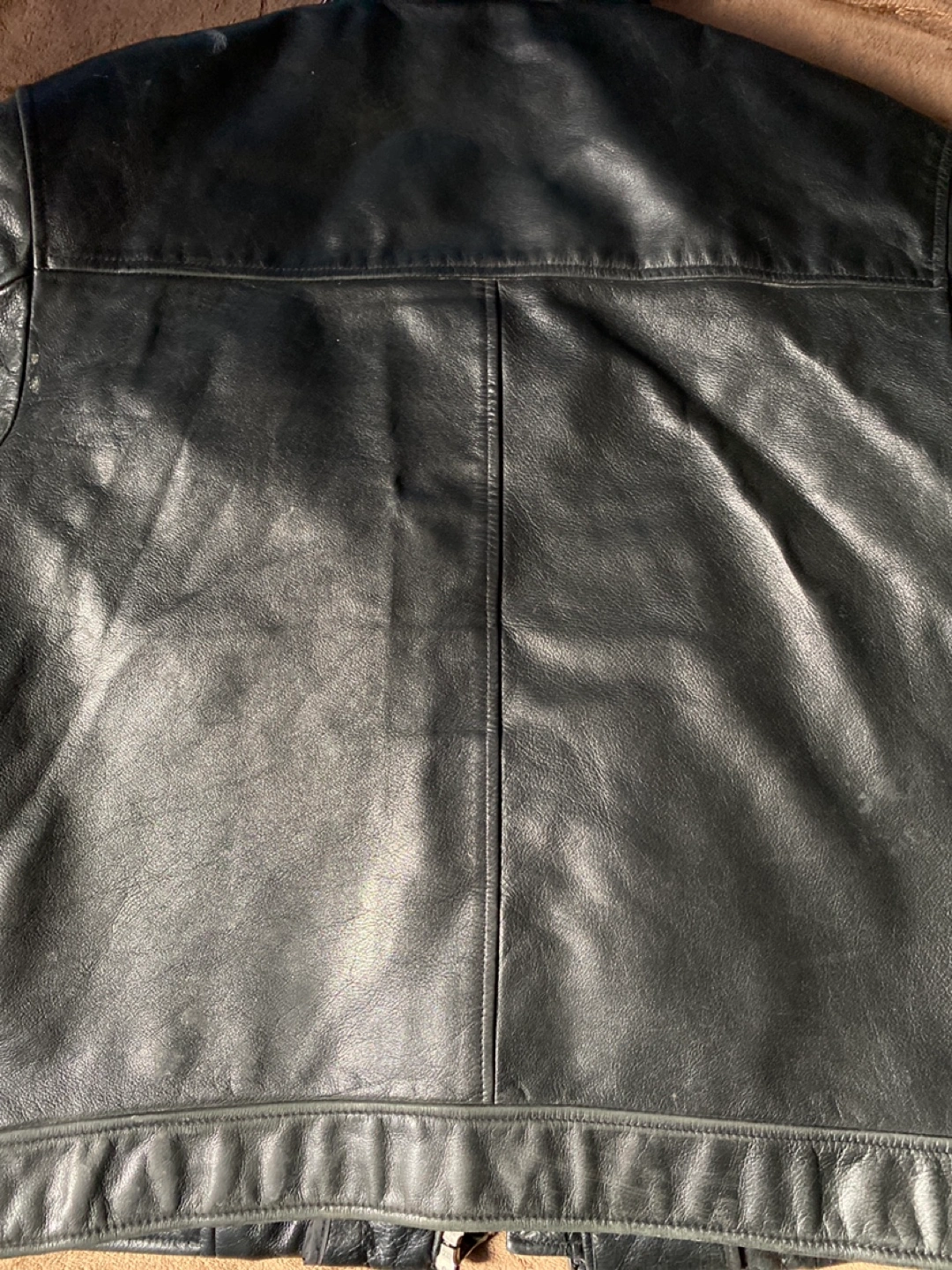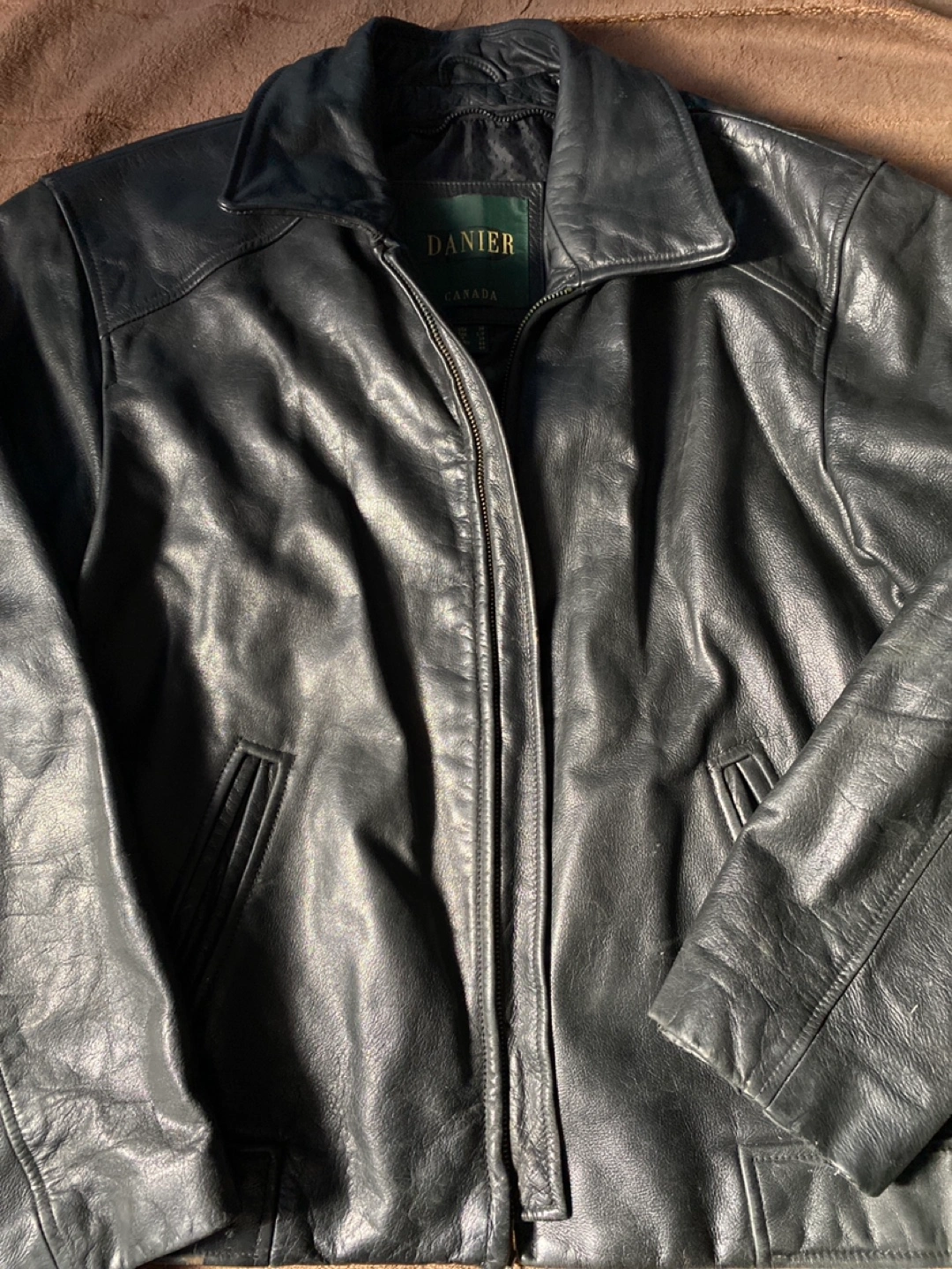 Genuine leather jacket. Designed in Canada. Features a zip closure and two front pockets. Excellent condition. Size 44. It will fit small/medium size.