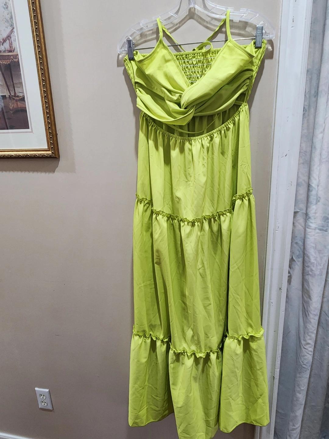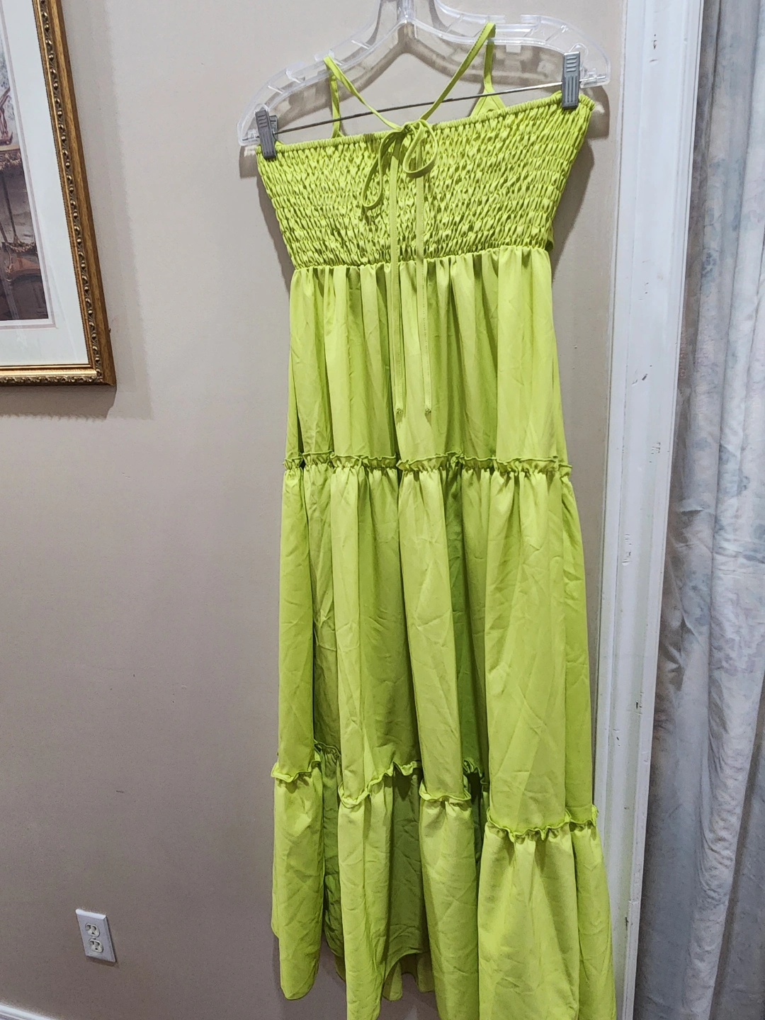 Beautiful lime green maxi dress. Features a tiered skirt and adjustable straps. Great for summer.