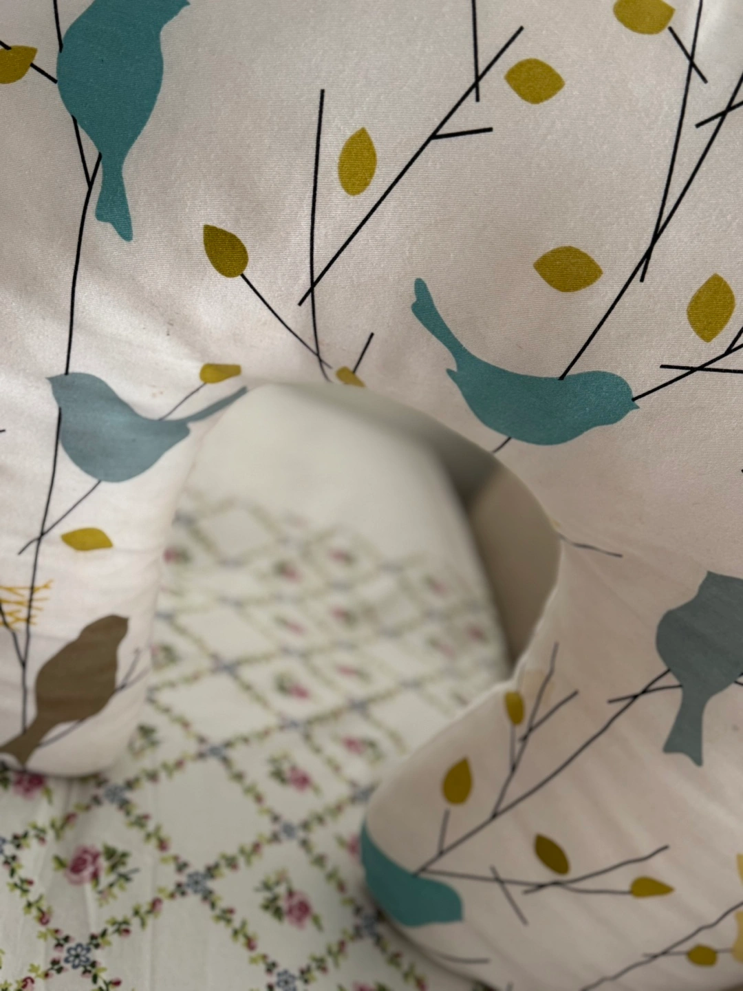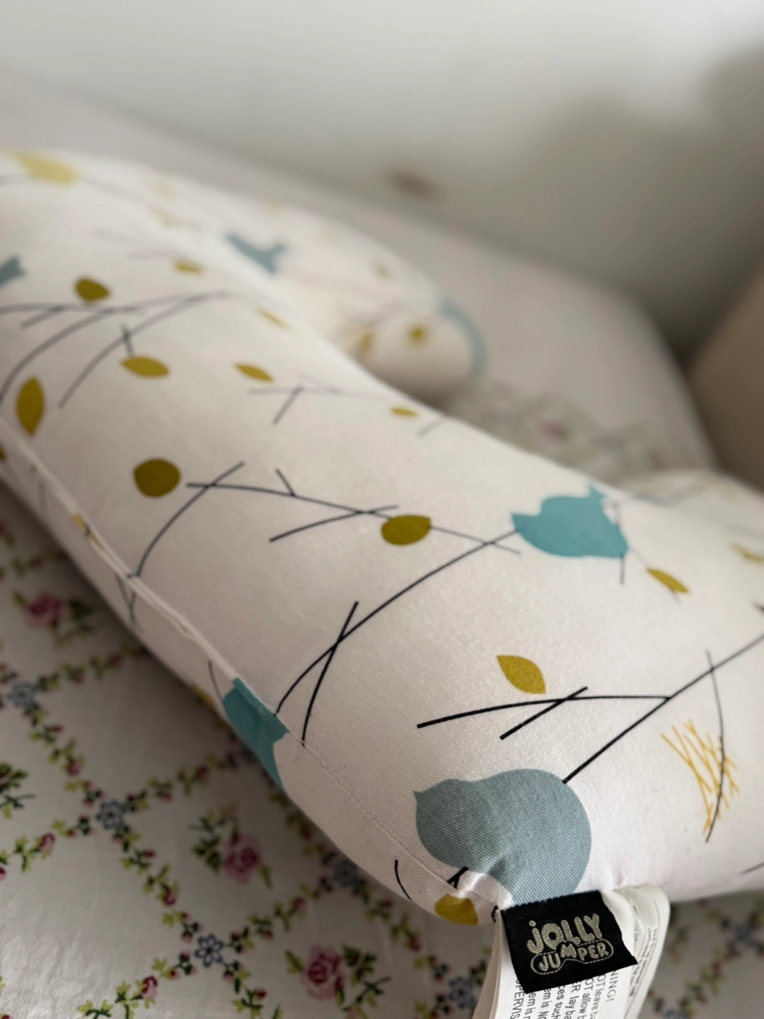 U-shaped nursing pillow. Features a cute bird and leaf print. Excellent for supporting baby during feeding.