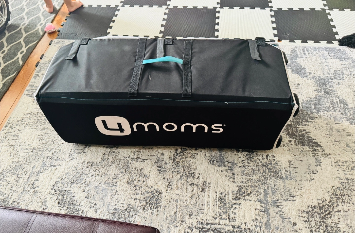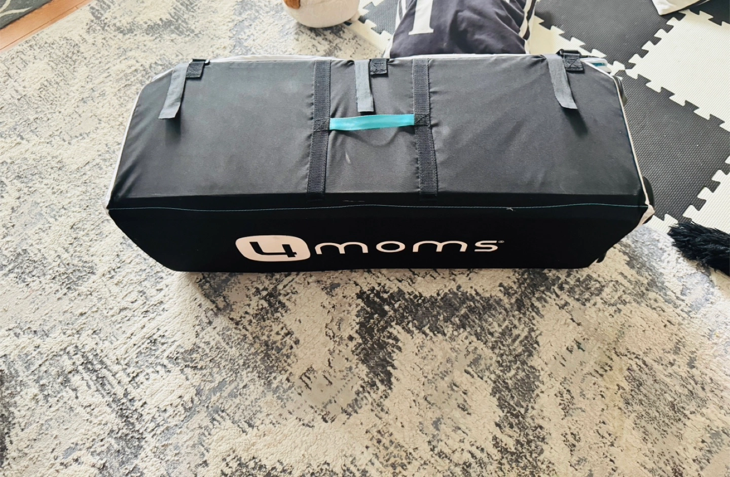 Lightly used 4moms Breeze Go Playard. Easy to set up and fold. Includes a teal changing mat. Great for travel or home use. Compact design for storage.