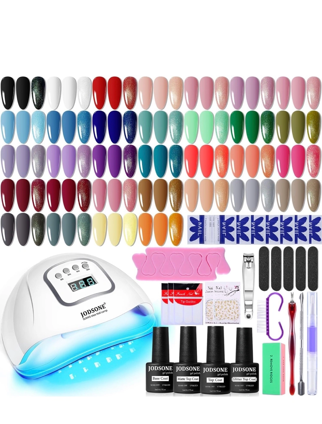 New JODSONE 36-colour gel nail polish kit. Includes UV lamp, base and top coats, and nail tools. Thirty-six colours in total. Perfect for at-home manicures.m
