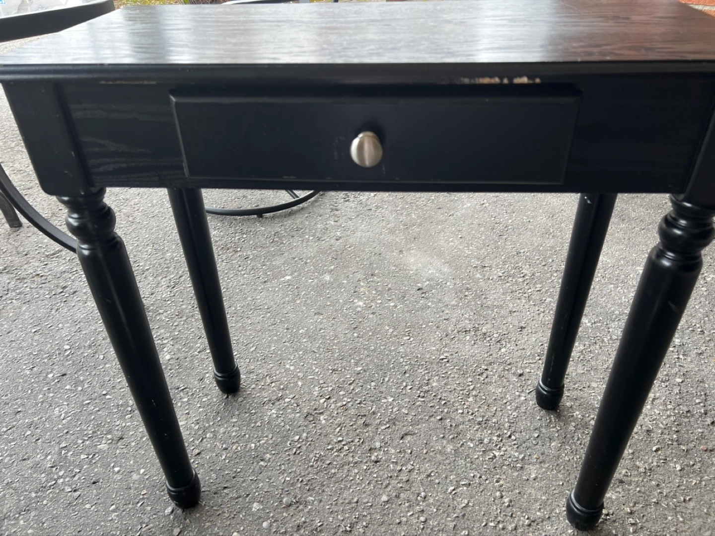 Small black console table. One drawer. Minor damage to the top. Turned legs. Good for entryway or small space.