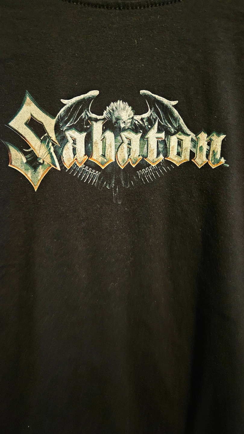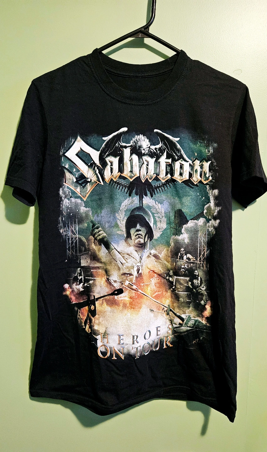Black t-shirt size M. Features Sabaton logo and artwork from the Heroes on Tour. Short sleeves, crew neck.