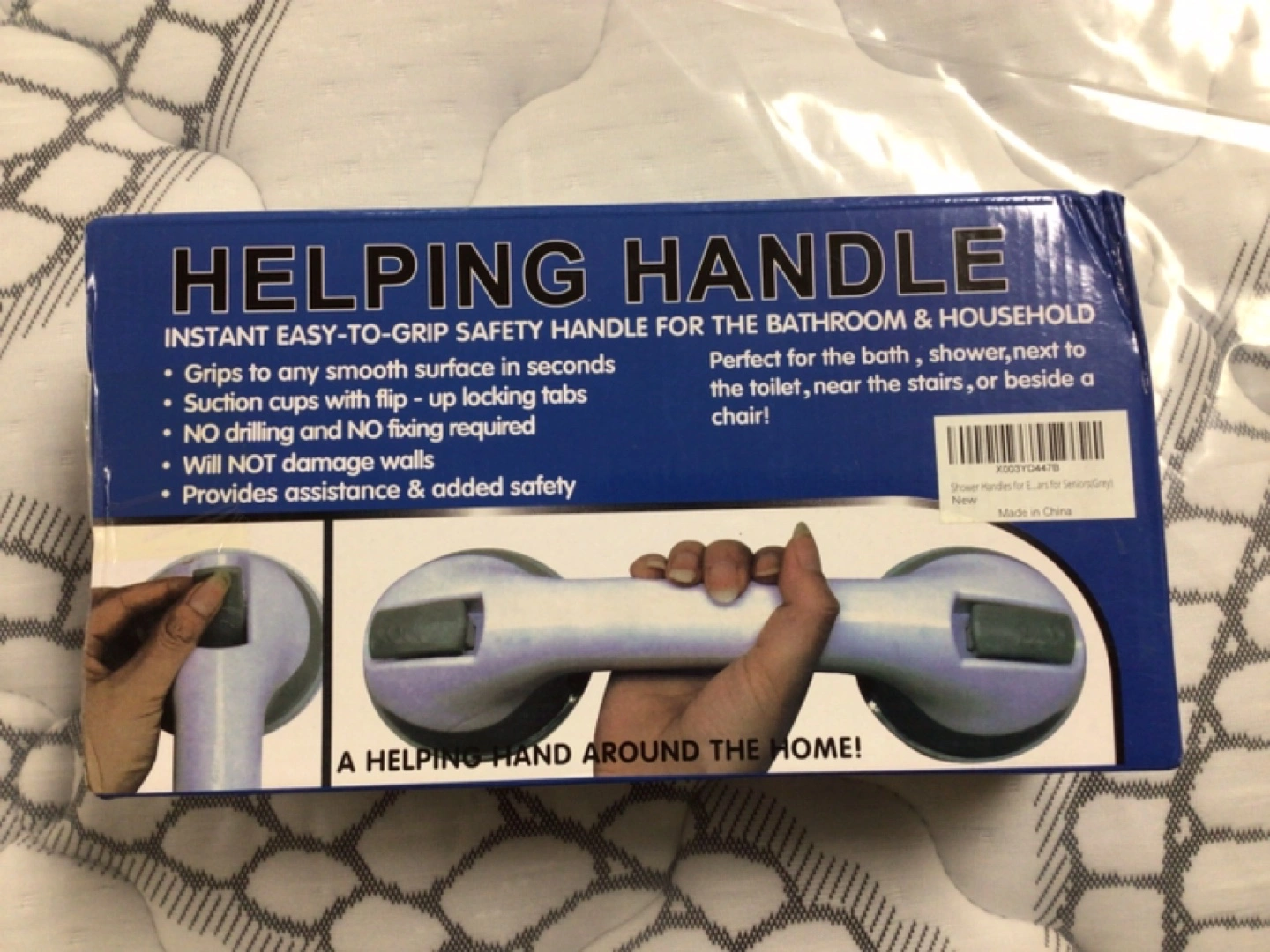 Instant easy-to-grip safety handle for bathroom and household. Grips to any smooth surface in seconds. Suction cups with flip-up locking tabs. No drilling and no fixing required. Will not damage walls. Provides assistance and added safety. Perfect for the bath, shower, next to the toilet, near the stairs, or beside a chair!