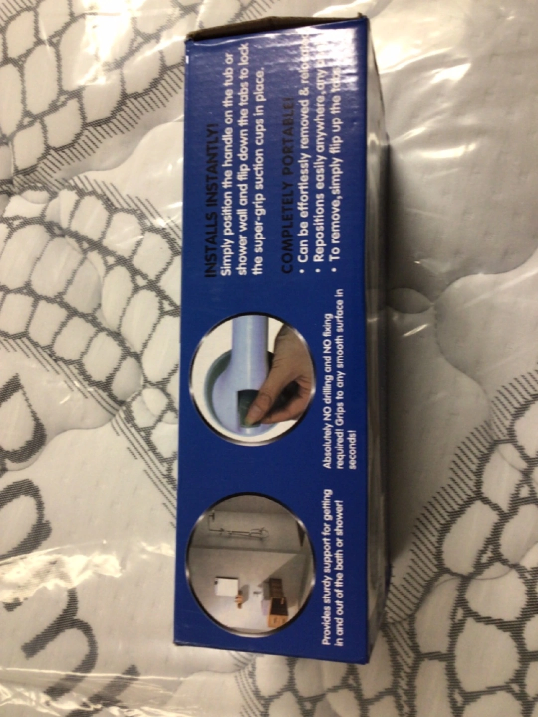 Instant easy-to-grip safety handle for bathroom and household. Grips to any smooth surface in seconds. Suction cups with flip-up locking tabs. No drilling and no fixing required. Will not damage walls. Provides assistance and added safety. Perfect for the bath, shower, next to the toilet, near the stairs, or beside a chair!