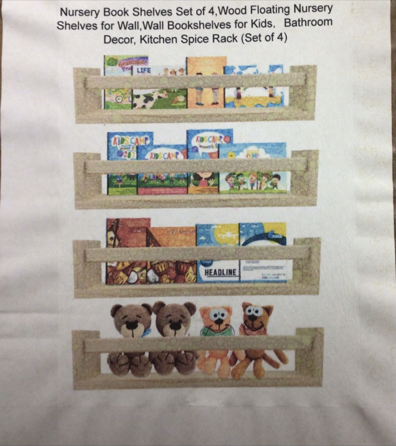 Four floating shelves. Perfect for nursery books, bathroom decor, or kitchen spices. Wooden construction. Easy wall mounting.