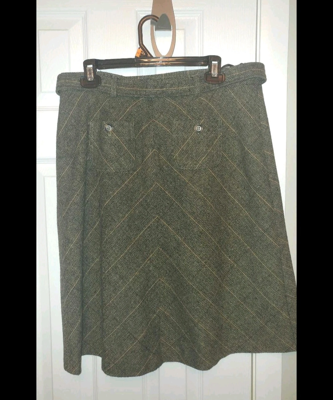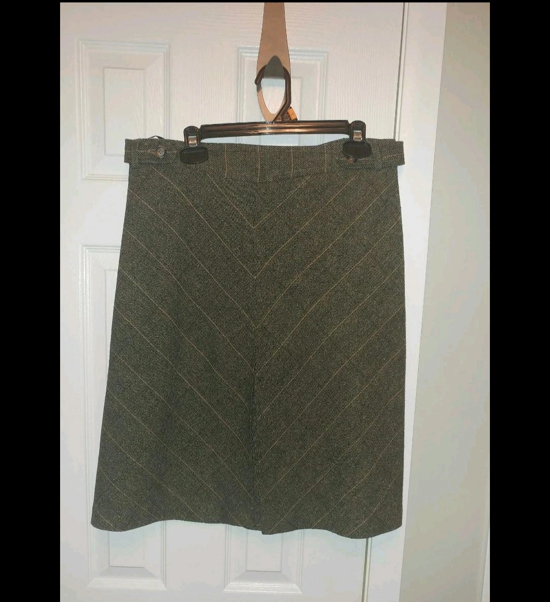 A-line skirt. Grey and beige tweed fabric. Features a waistband and two pockets. Very good condition.
