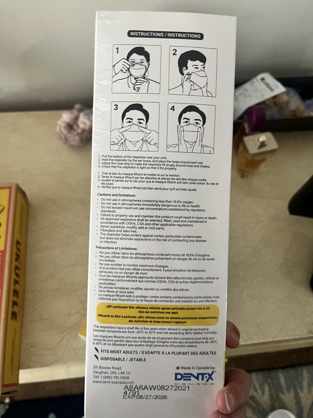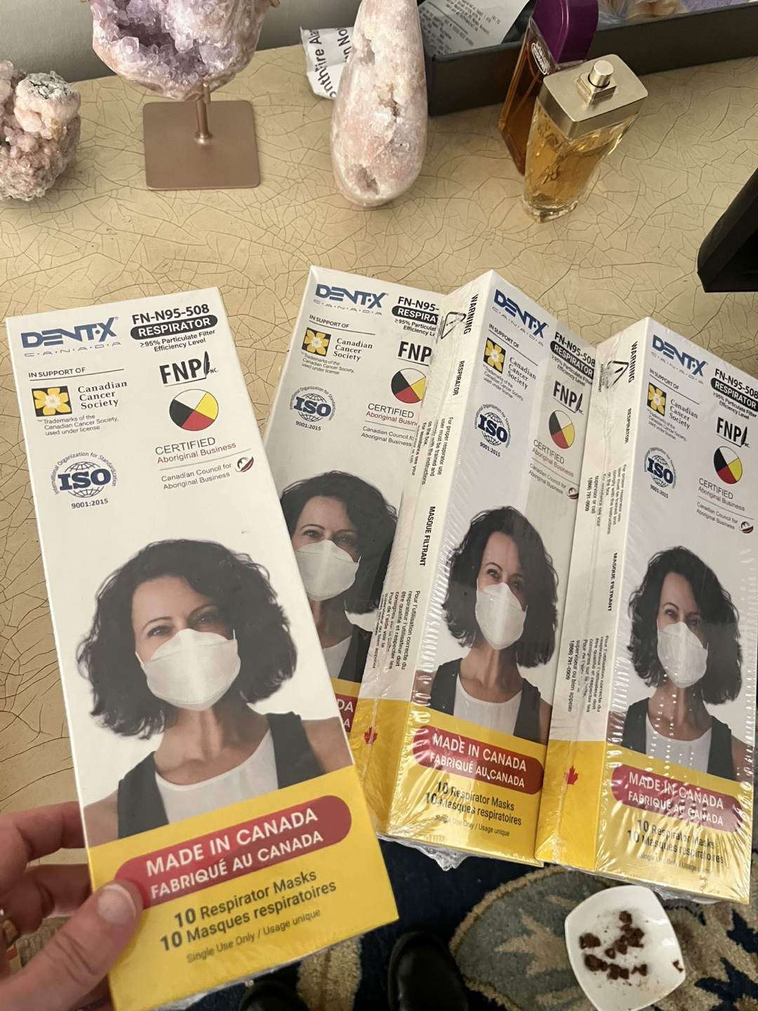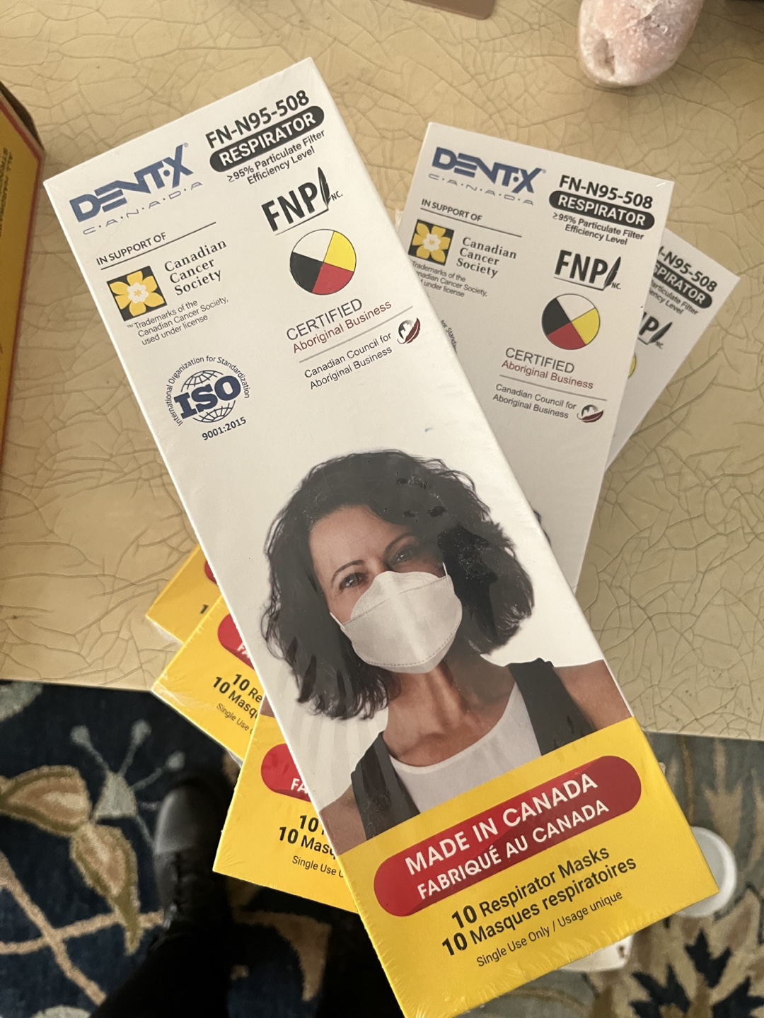 Four boxes of Dentx FN95-508 respirators. Ten masks per box. Single-use only. Made in Canada. 99% particulate filter efficiency. Packaging shows expiry date of 08/27/2026.