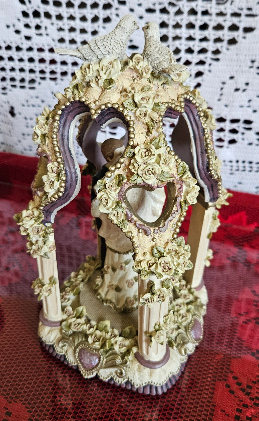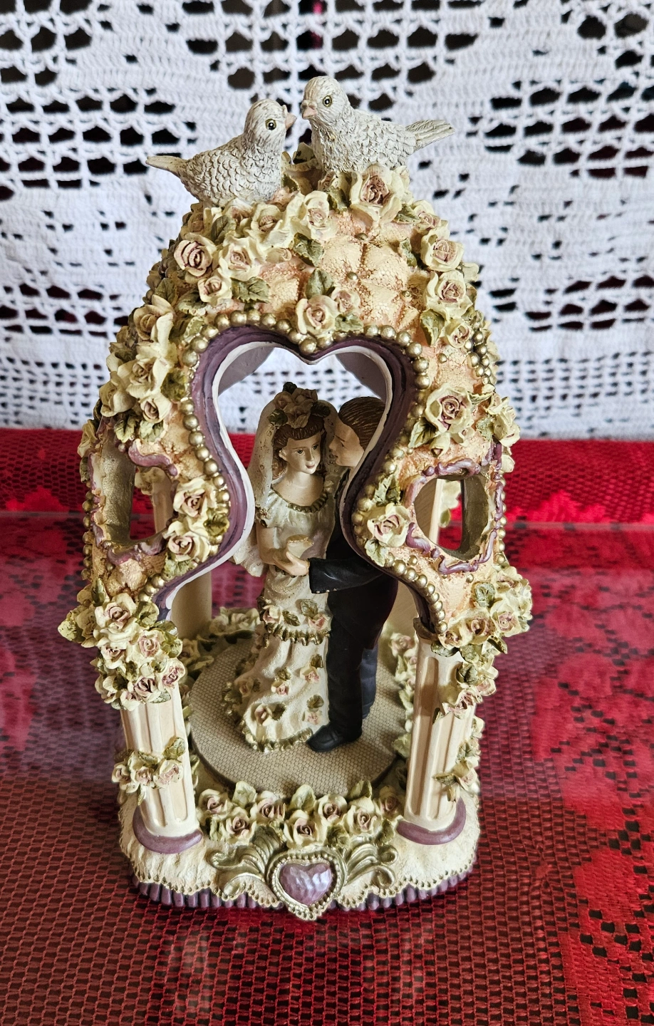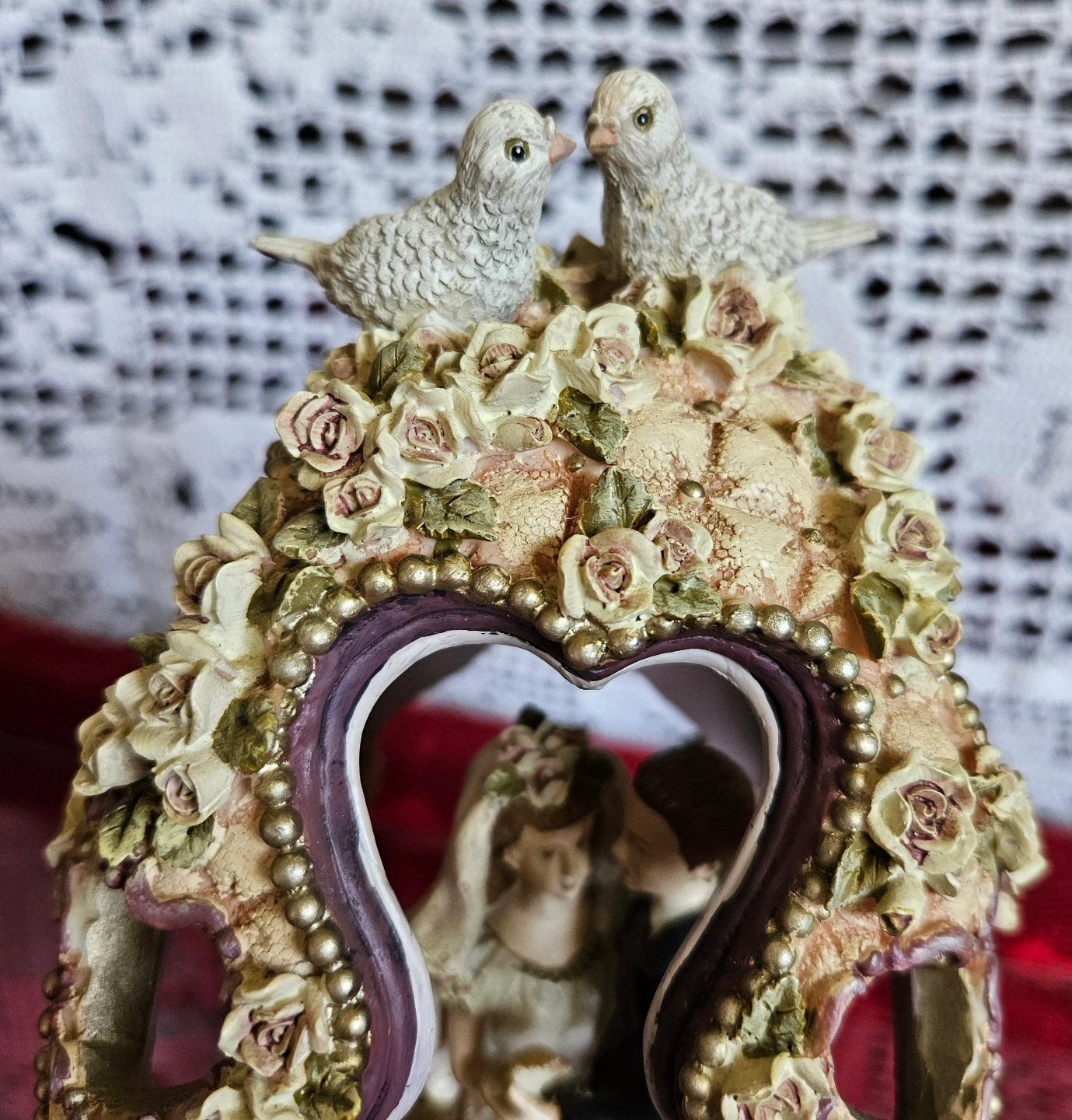 This figurine depicts a bride and groom standing under a heart-shaped arch, adorned with delicate roses, doves, and pearl-like accents. The base and archway feature a similar floral and pearl design, with a color palette of soft white, pink, purple, and green. It is designed to serve as a cake topper or decorative centerpiece for weddings.