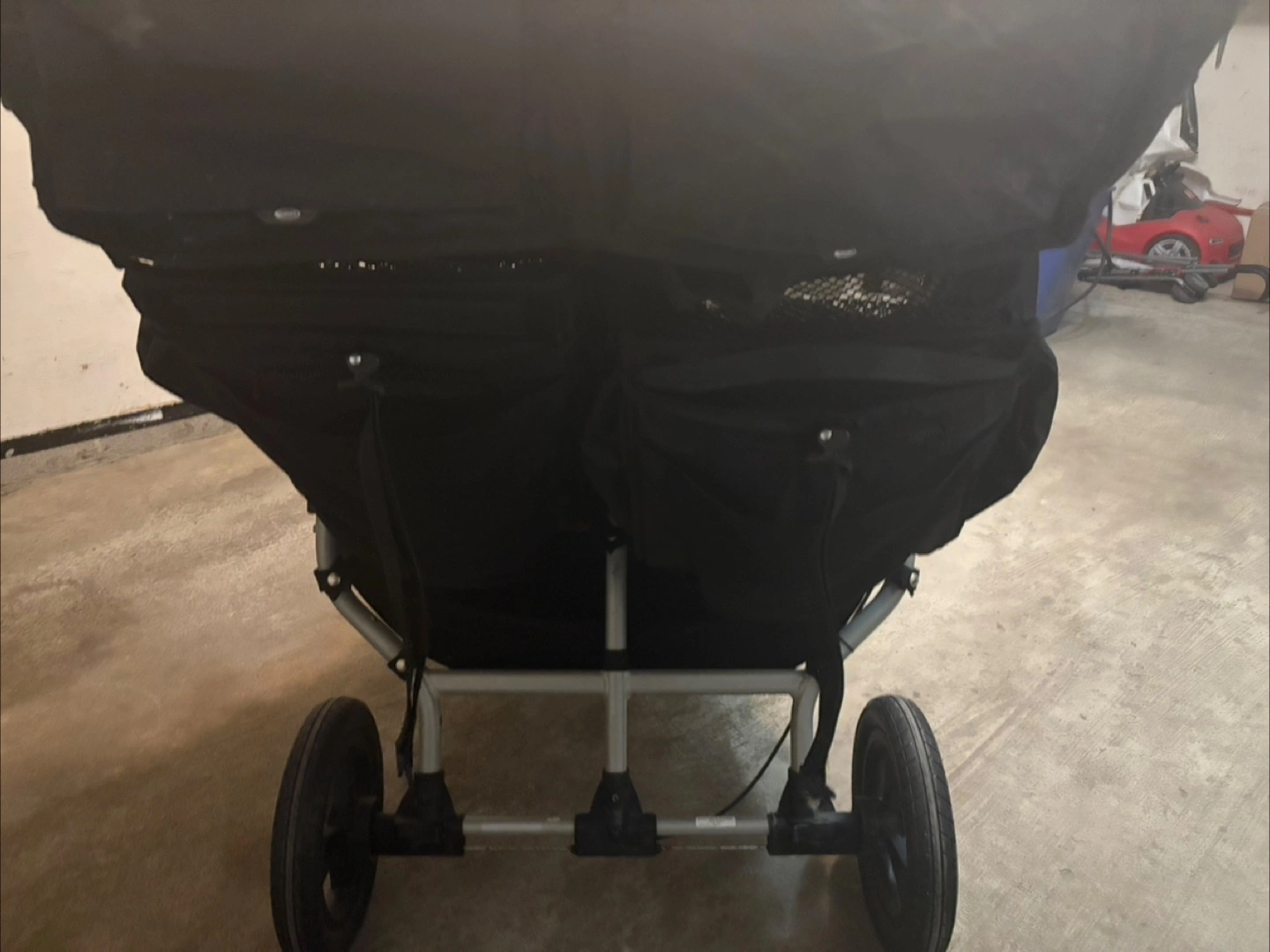 Double stroller, red and beige colour scheme. Suitable for twins or two young children. Features include large storage compartments and sun canopy. Super easy to steer with the swivel front wheels (which are also lockable, when needed). Seats have multiple recline positions. Folds up easily in one step!