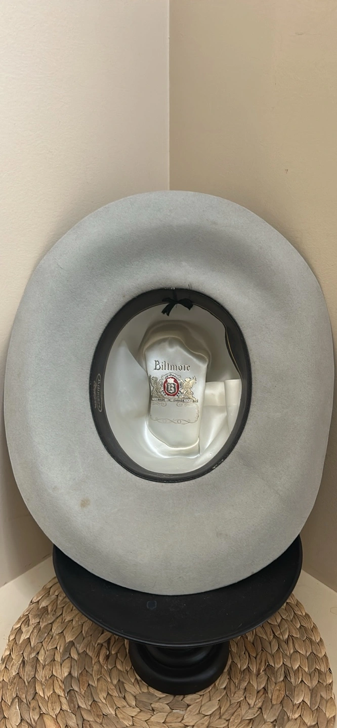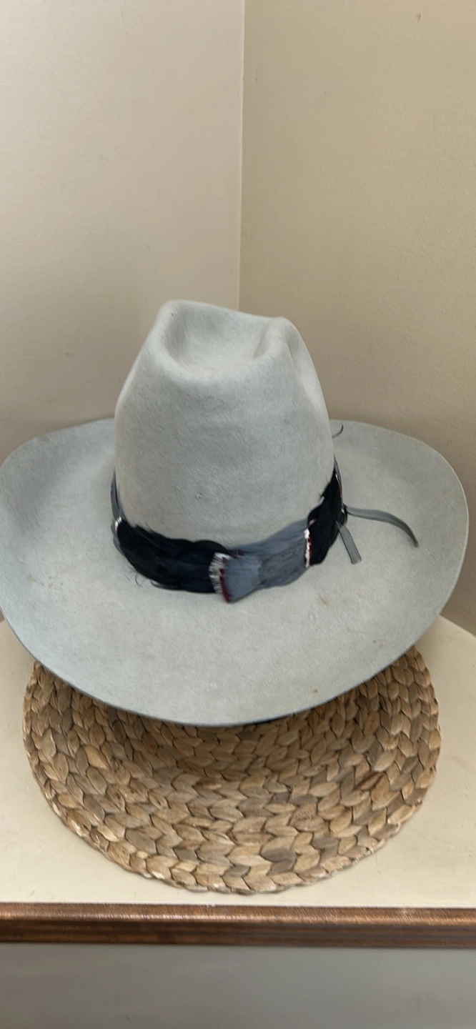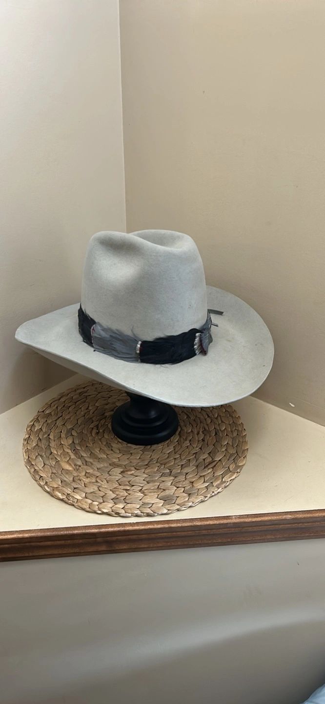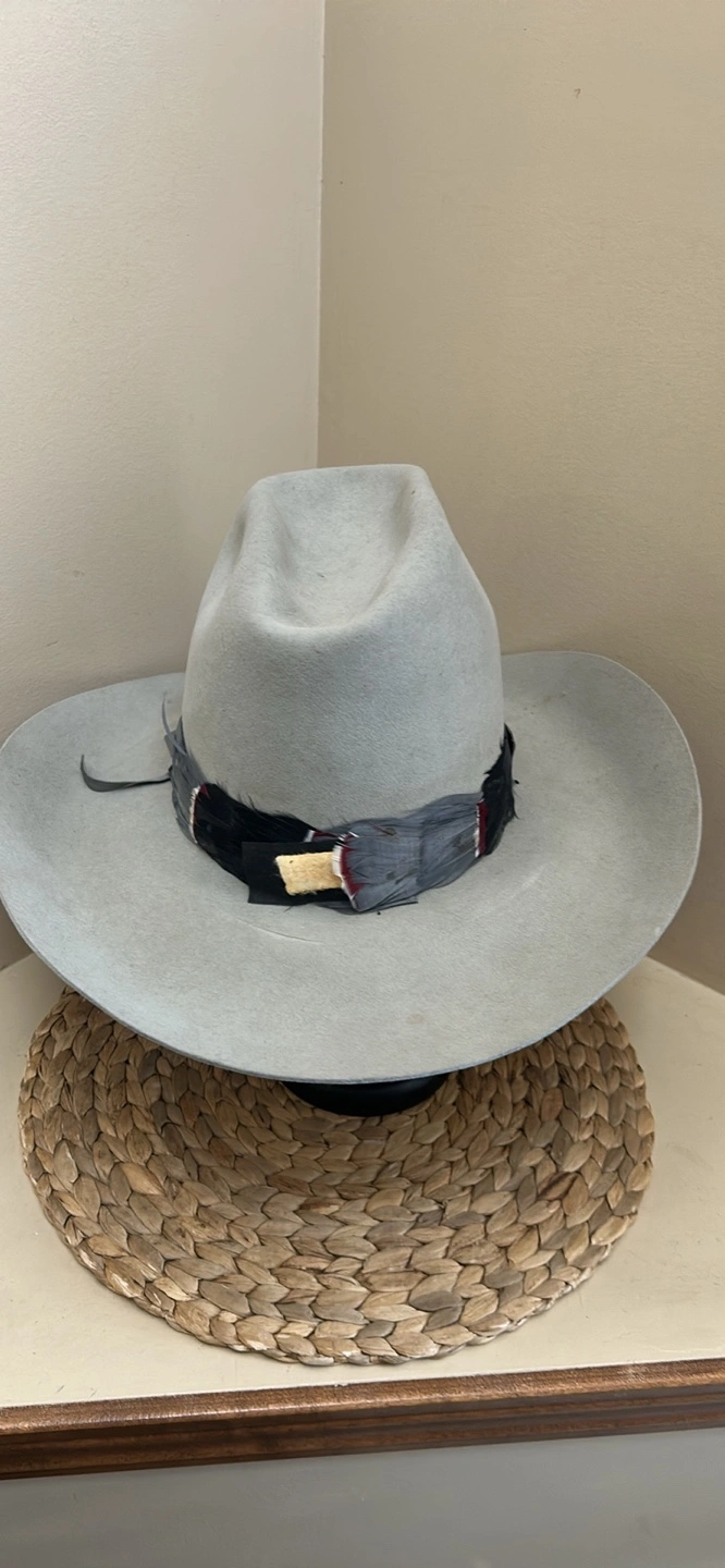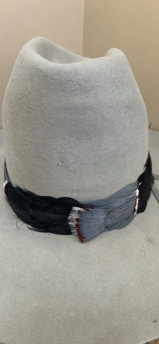 Grey felt cowboy hat. Features a unique feather band. Vintage. Has some wear but overall good used condition