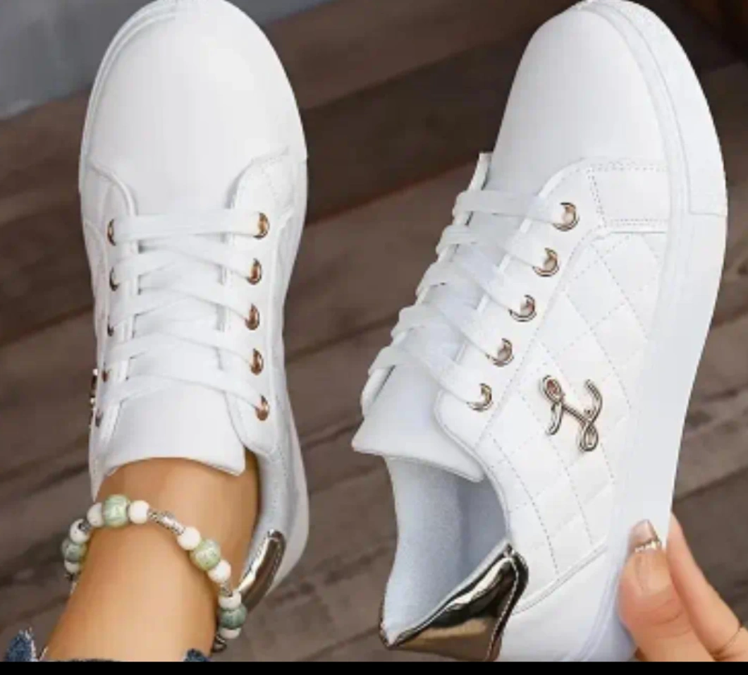 Pair of white leather sneakers. Lace-up closure. Gold-toned accents and metallic heel detail. Casual style.