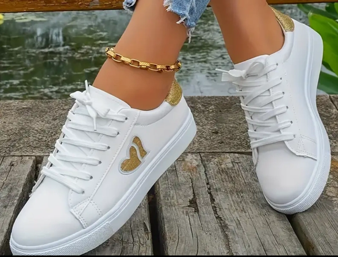 Women's casual white sneakers. Features gold glitter accents and gold heart detail. Lace-up closure. Comfortable and stylish.