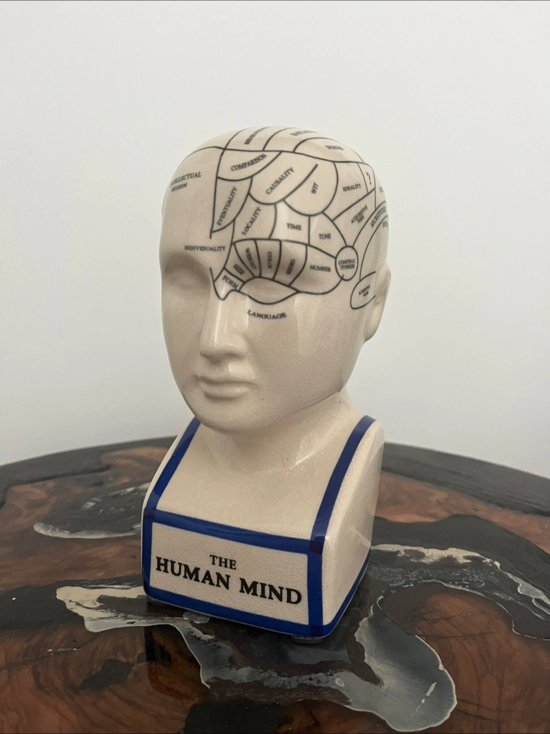 Brand new small ceramic bust. Features a detailed diagram of the human mind. Cream coloured with blue accents. Collectible item. Perfect for as a desk decor piece.