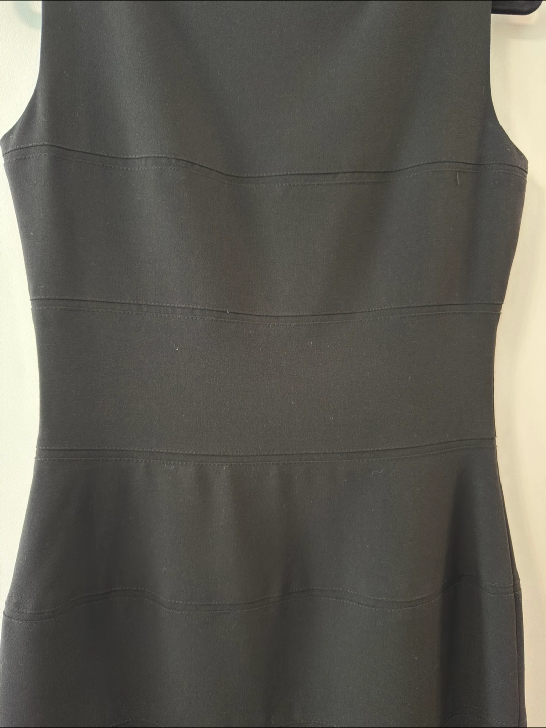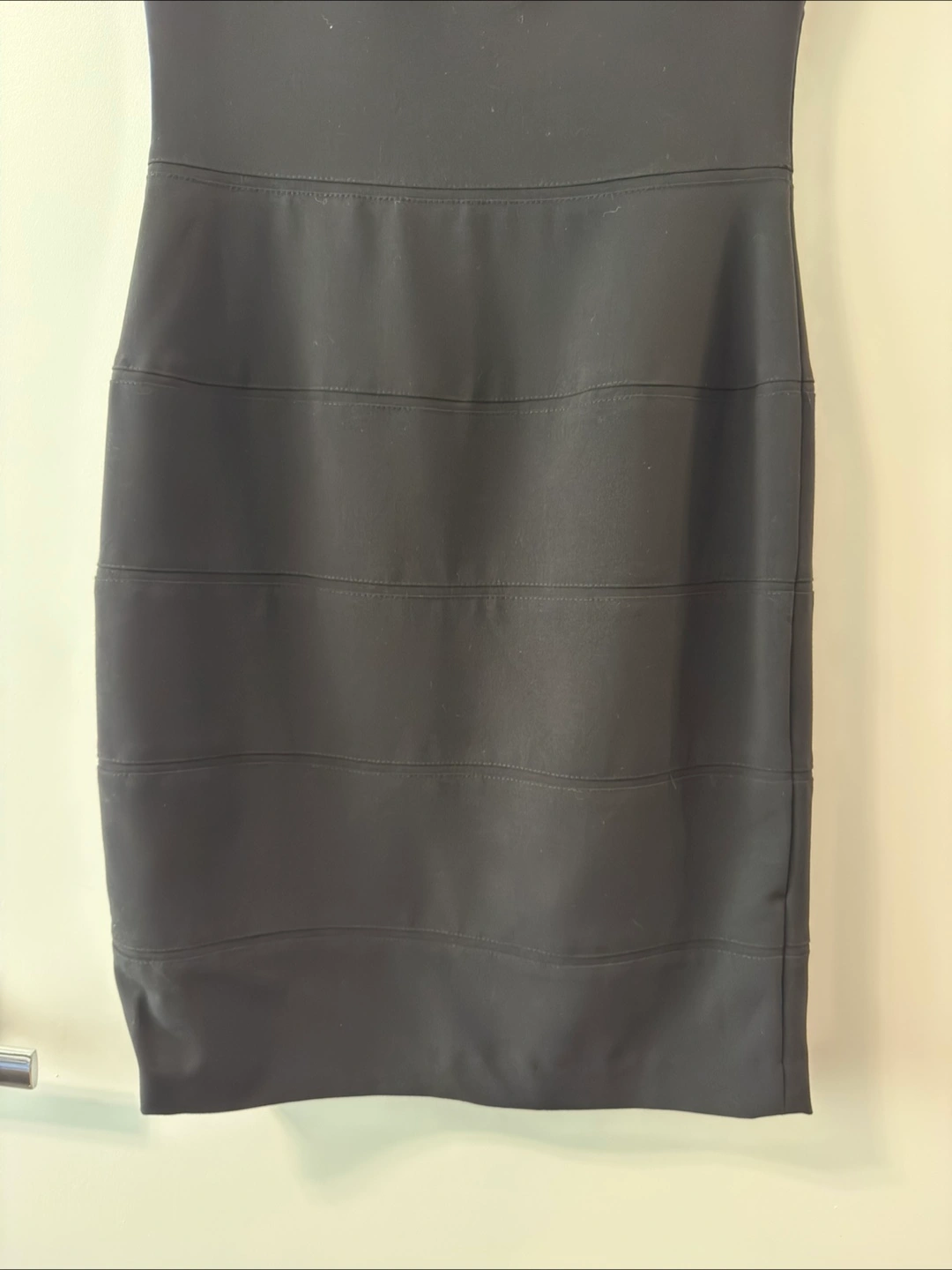 Classic black bandage dress. Sleeveless, form-fitting silhouette. Back zipper closure.