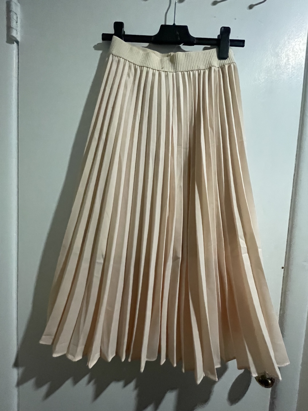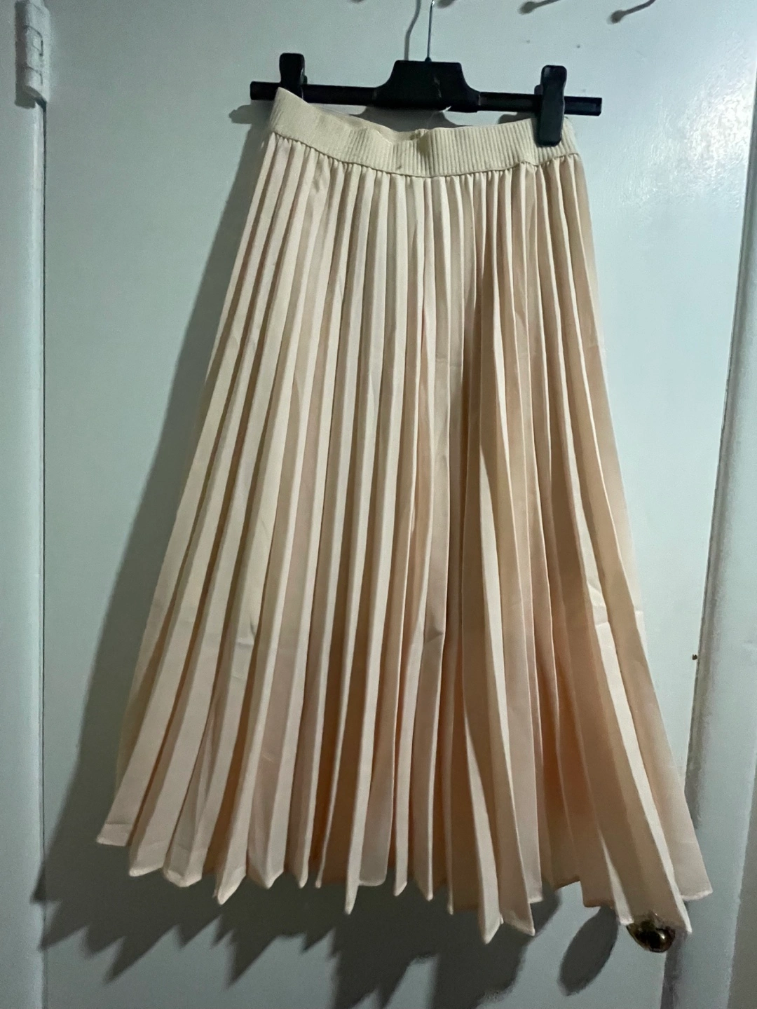Elegant pleated midi skirt. Creamy beige colour. Elastic waistband. Flowy fabric. Fits Small to Large. Perfect for spring or summer.
