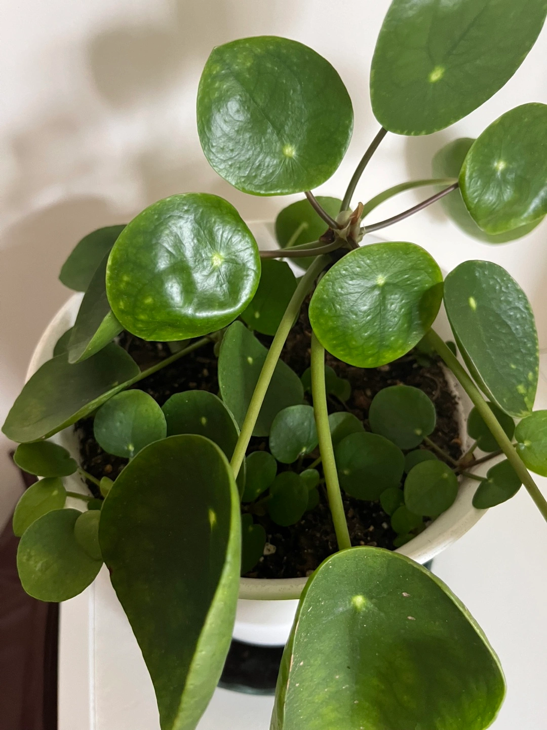 Large, healthy Pilea Peperomioides in a white pot. Several new propagations started. Great addition to any home. Not including the saucer. Pick up only.