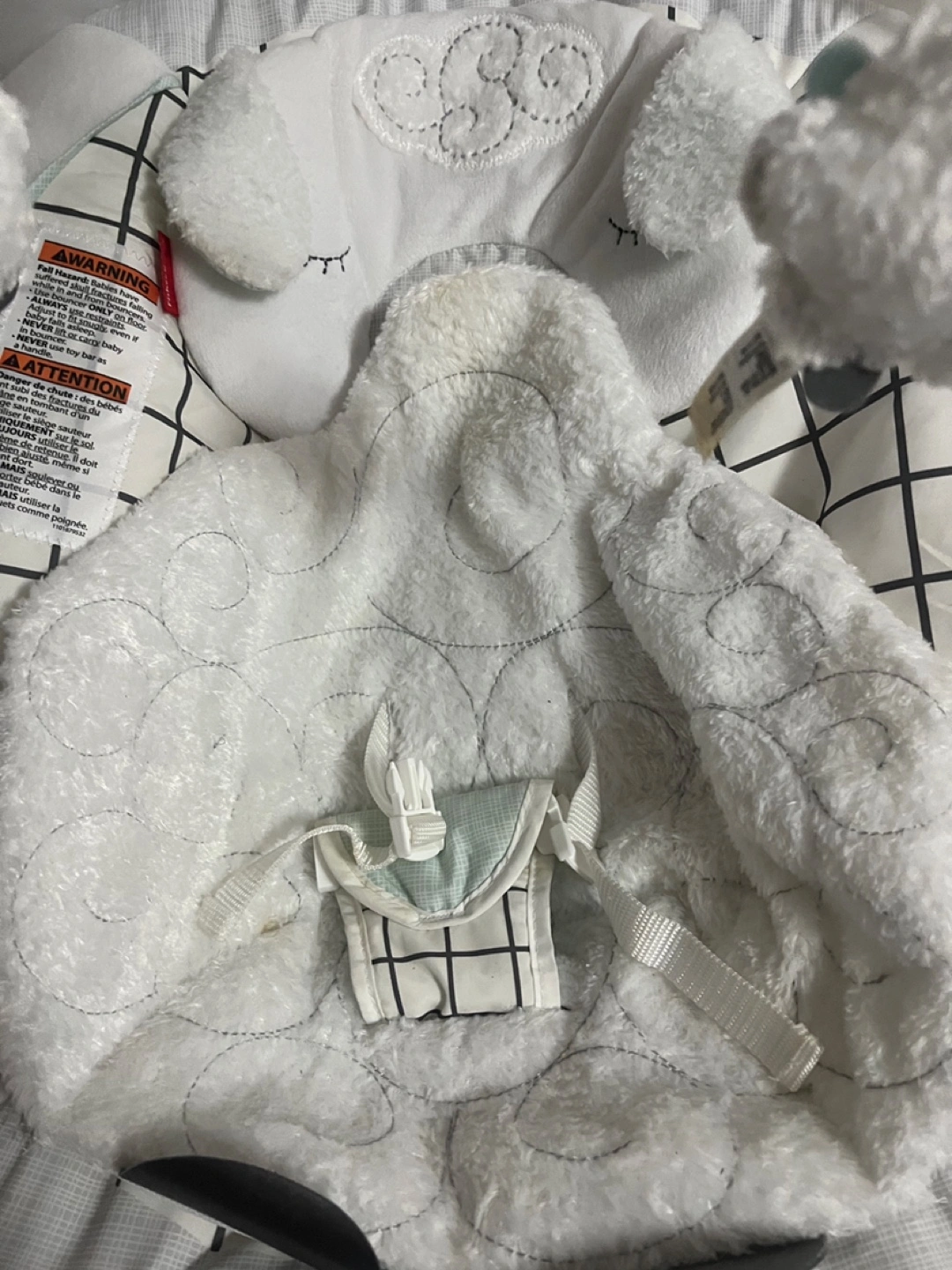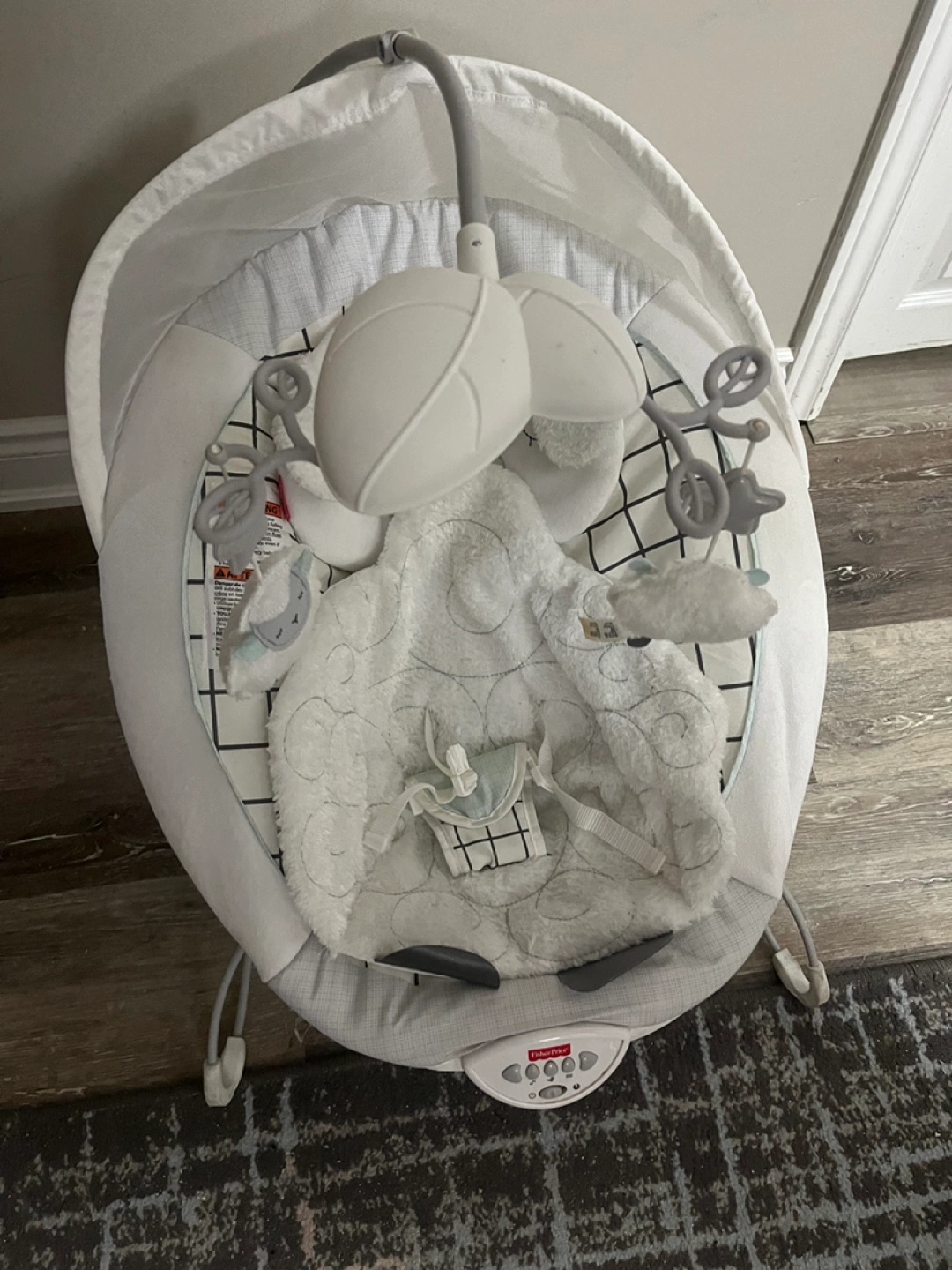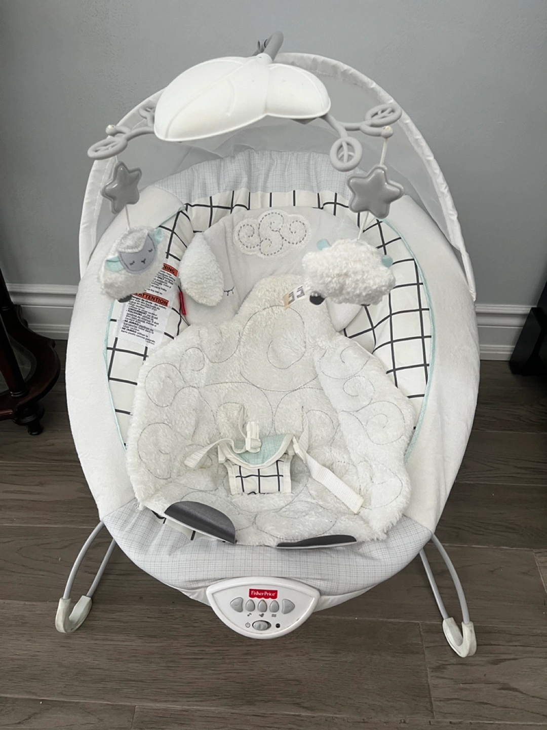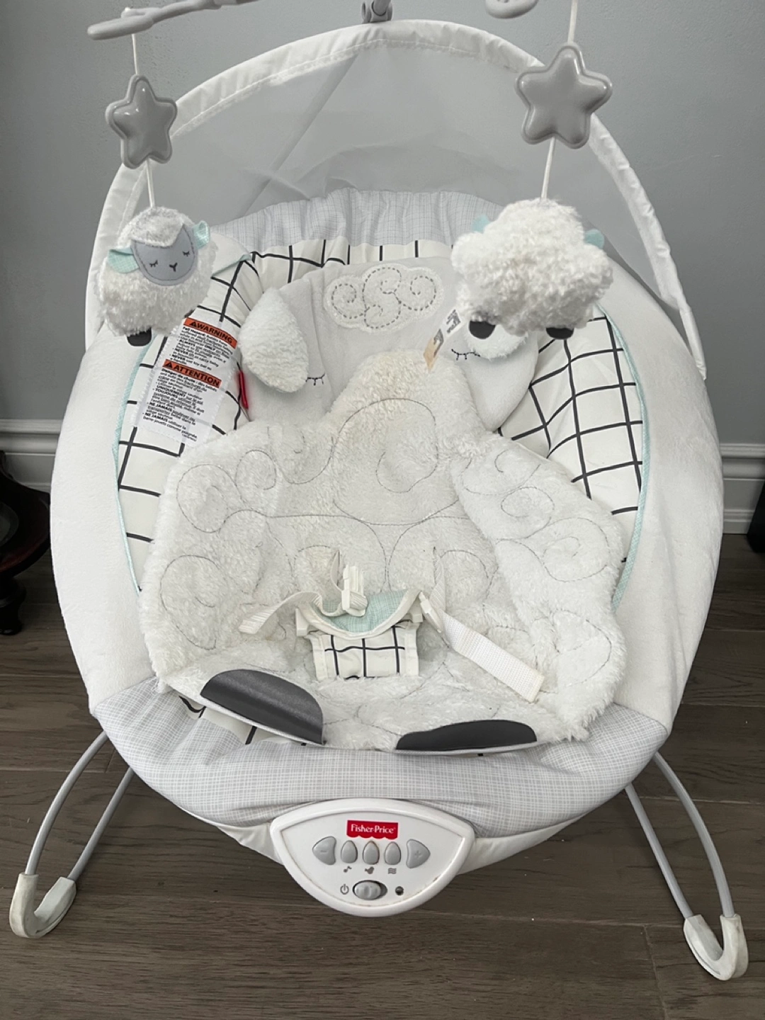 Baby cradle bouncer. Features calming vibrations and soothing sounds. Soft, plush sheep design. Overhead mobile with playful toys. Gently used. Fisher Price