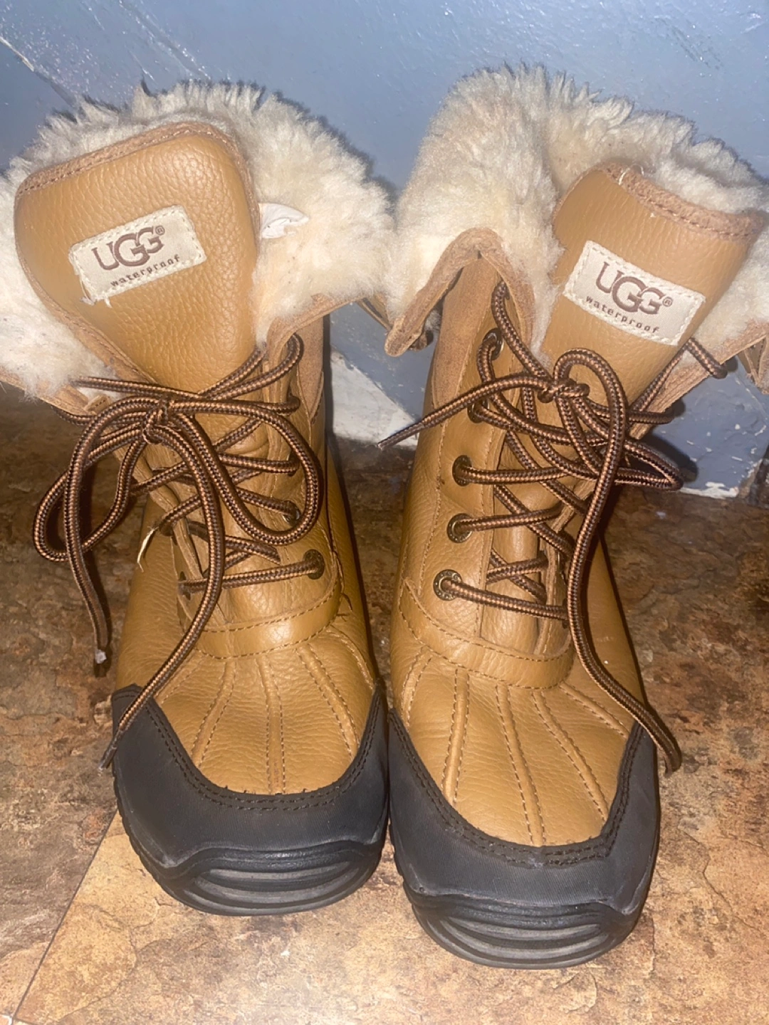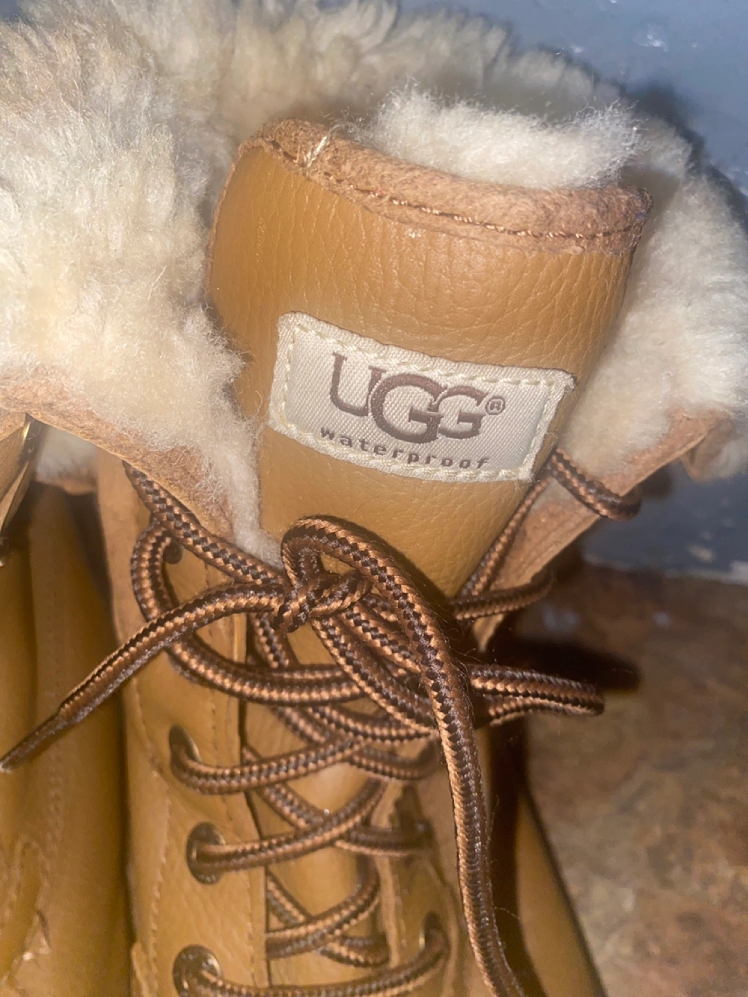 Women's UGG waterproof leather boots. Brown leather exterior, warm shearling lining. Lace-up closure. Durable sole. Size 7. Excellent for winter weather. Pick up location Royal York and Mimico