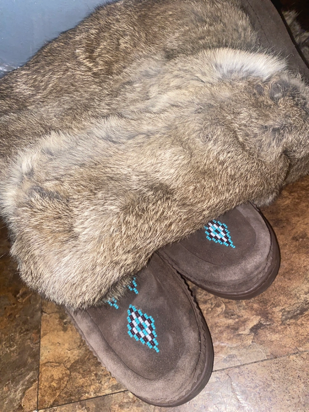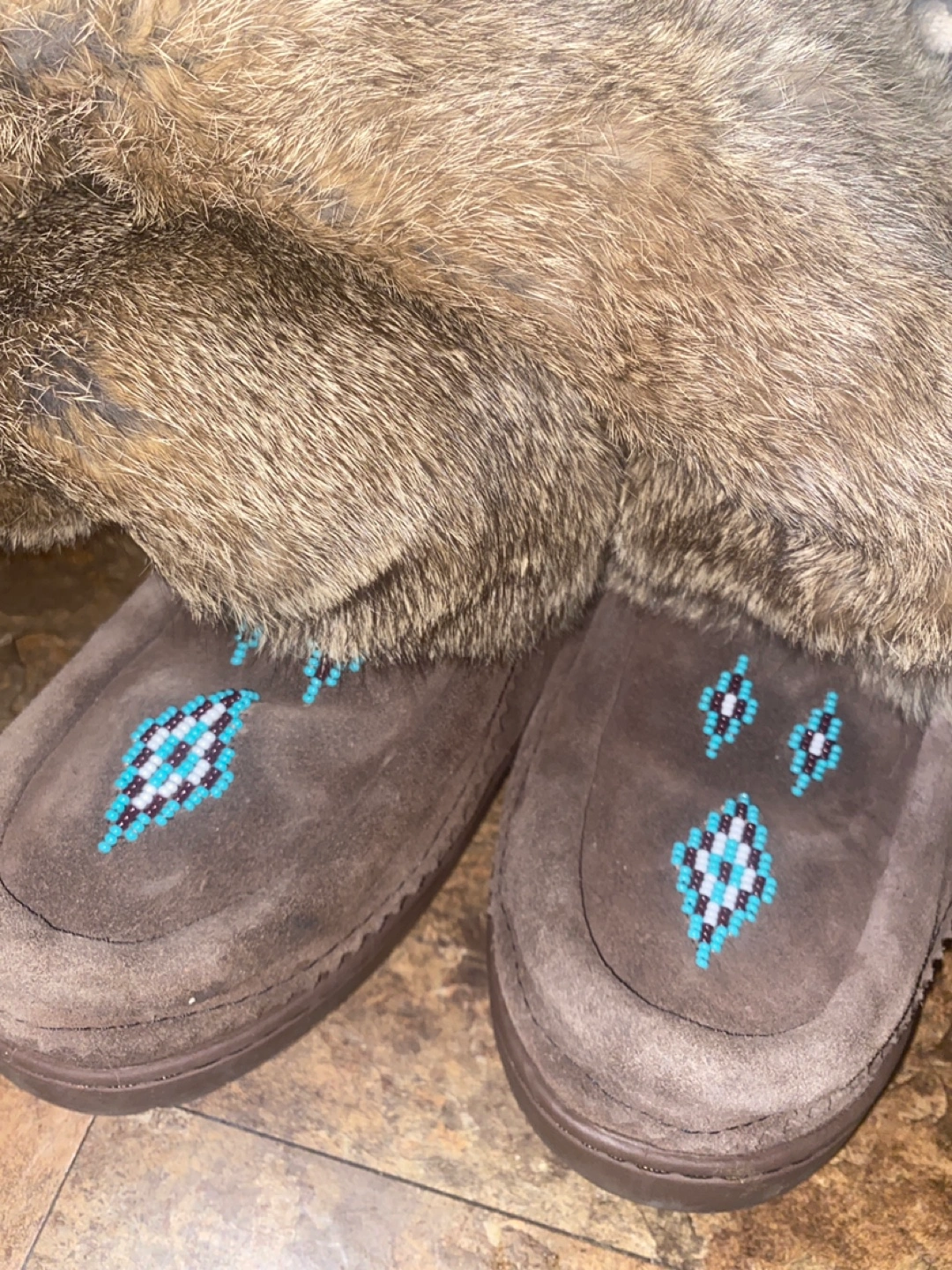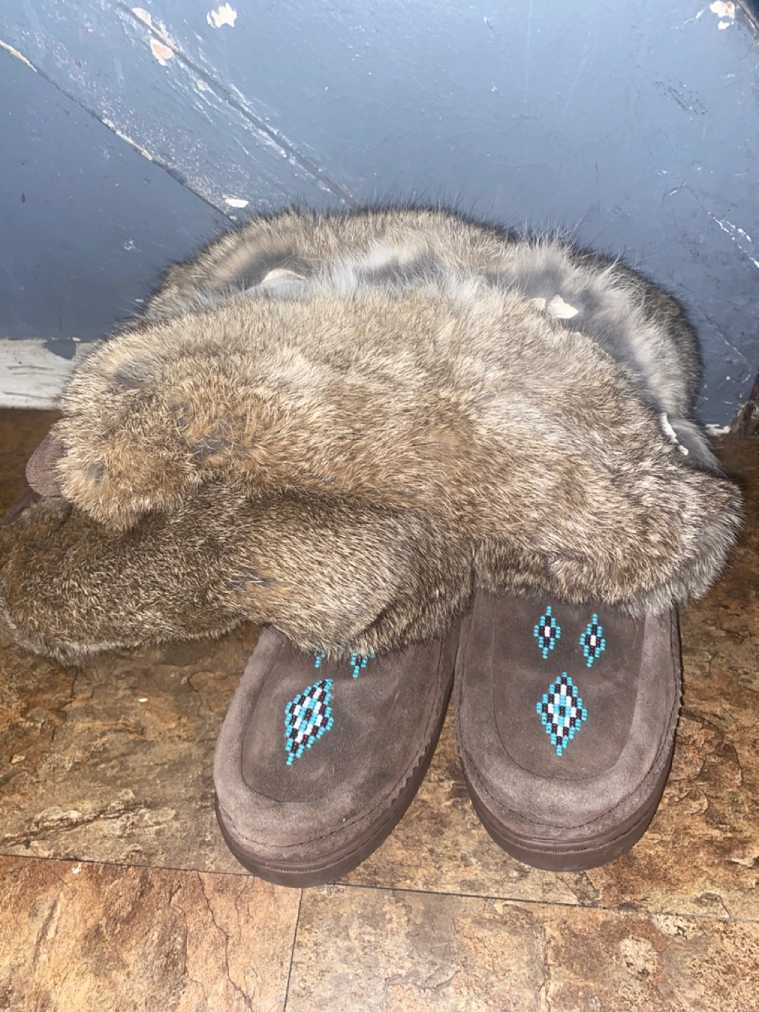 Brown suede mukluk boots. Features teal and white beaded designs. Soft fur cuffs. Vibram soles. I bought these boots and lost the receipts . Just noticed itβs ripped on the side as shown on the pictures please make thanks . Pick up location Royal and Mimico