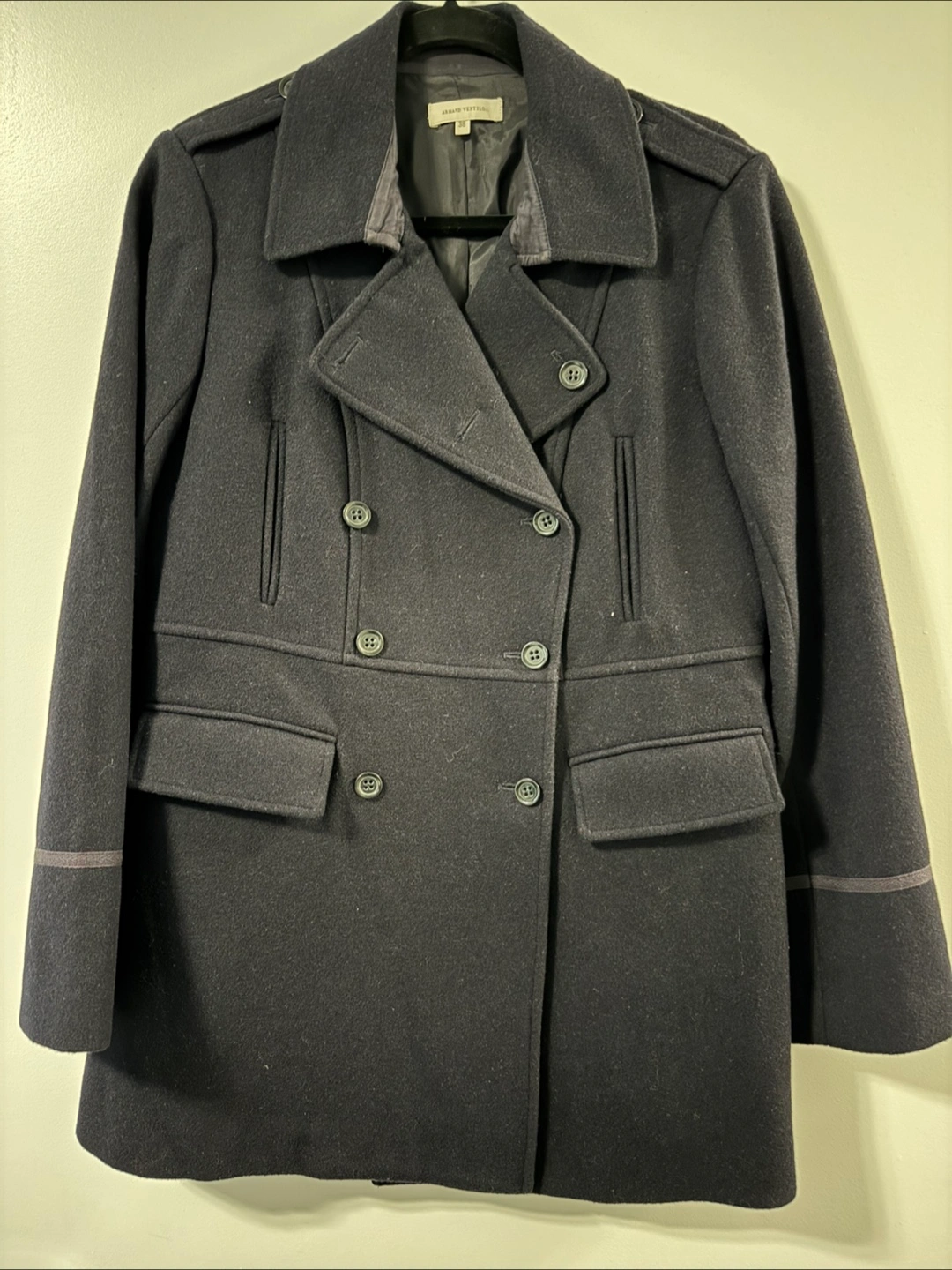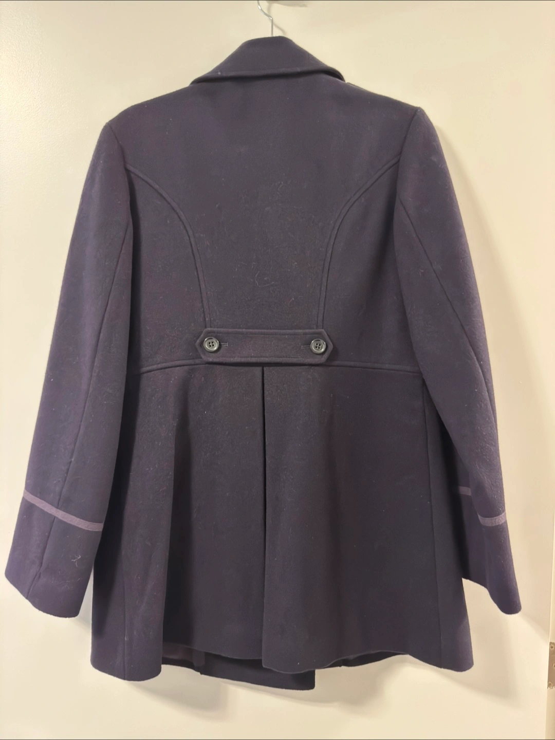 Dark navy blue peacoat. Double breasted. Size 38. Features pockets and a back vent. Long sleeves. Wool blend.