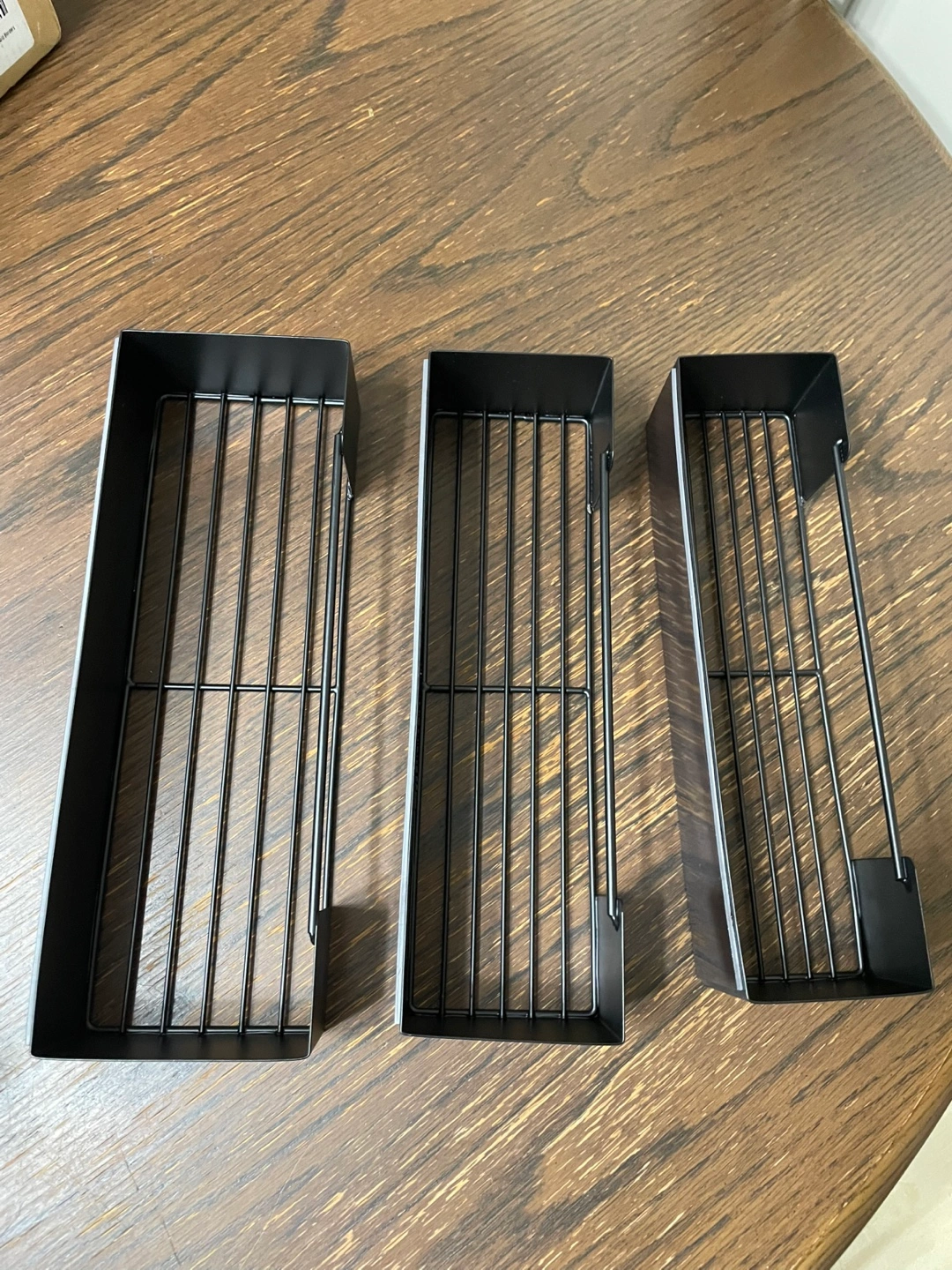 Three black metal shelves. Perfect for organizing spices, toiletries, or other small items. Wall-mountable design. Minimalist aesthetic.