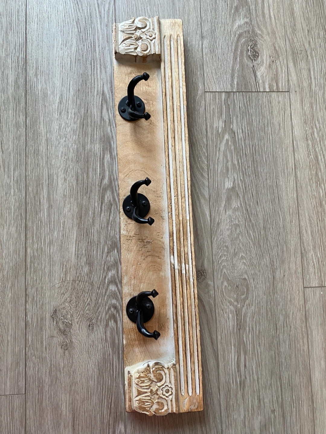 Charming wall-mounted coat rack. Features three black metal hooks. Distressed whitewashed wood. Ornate detailing. Perfect for entryway or hallway.