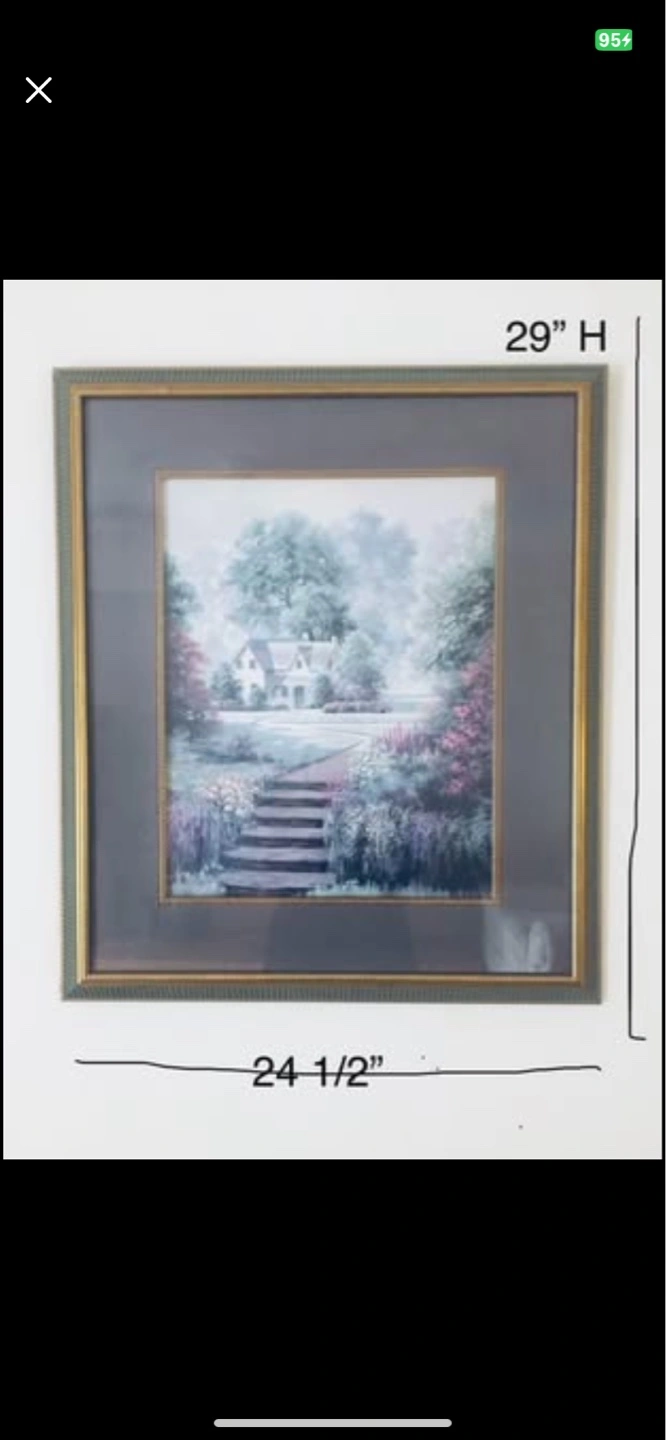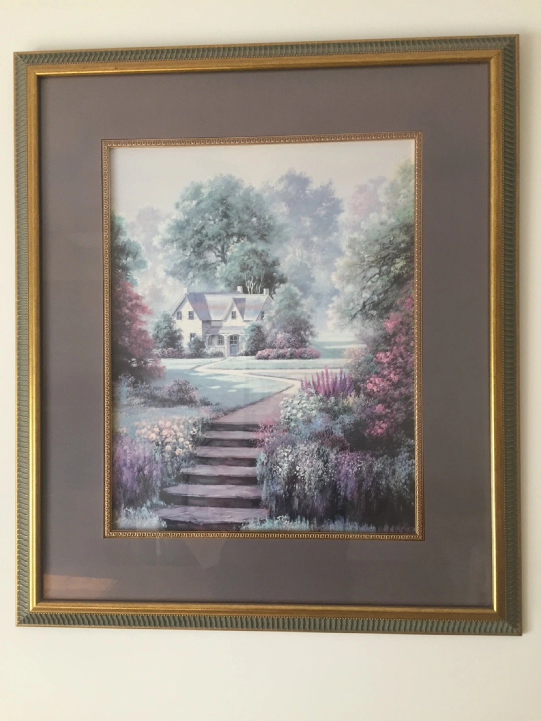 Beautiful framed print. Features a cottage garden scene. Measures 24 1/2" wide and 29" high. Gold and grey frame.