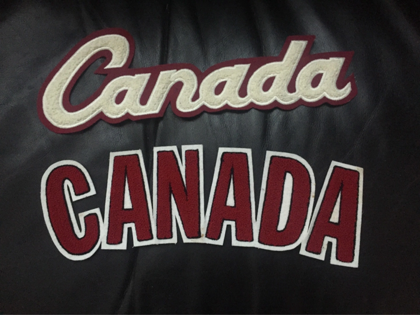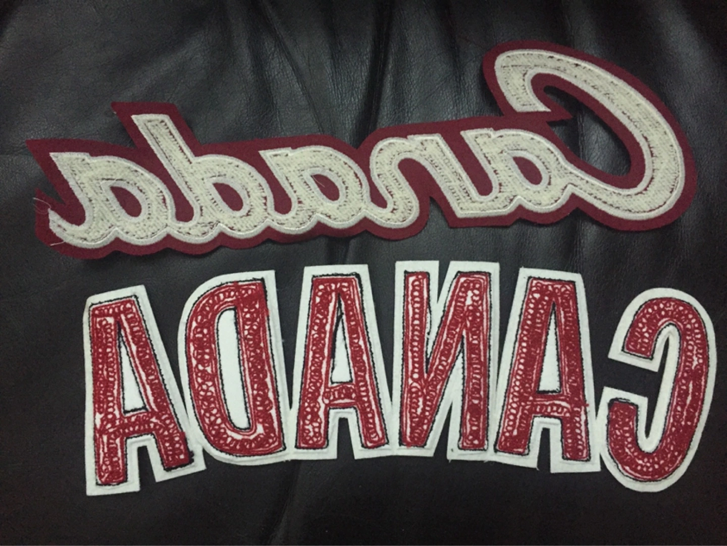 56Pair of embroidered felt patches. Features the word "Canada" in red and cream. Great for jackets, bags, or other projects.