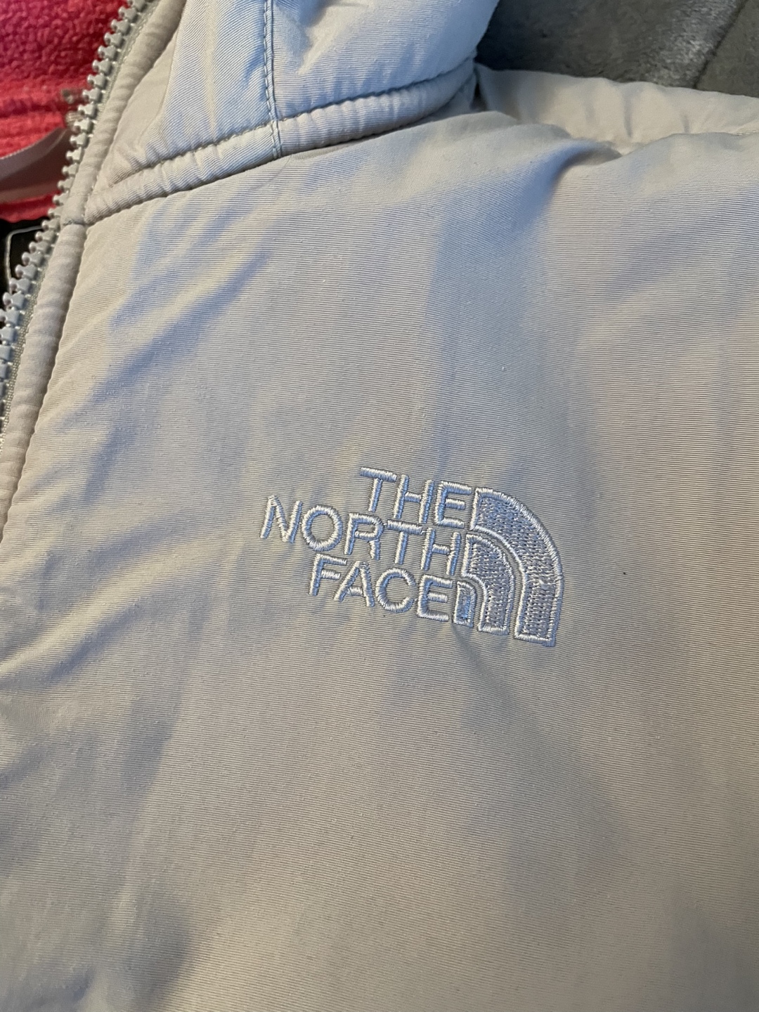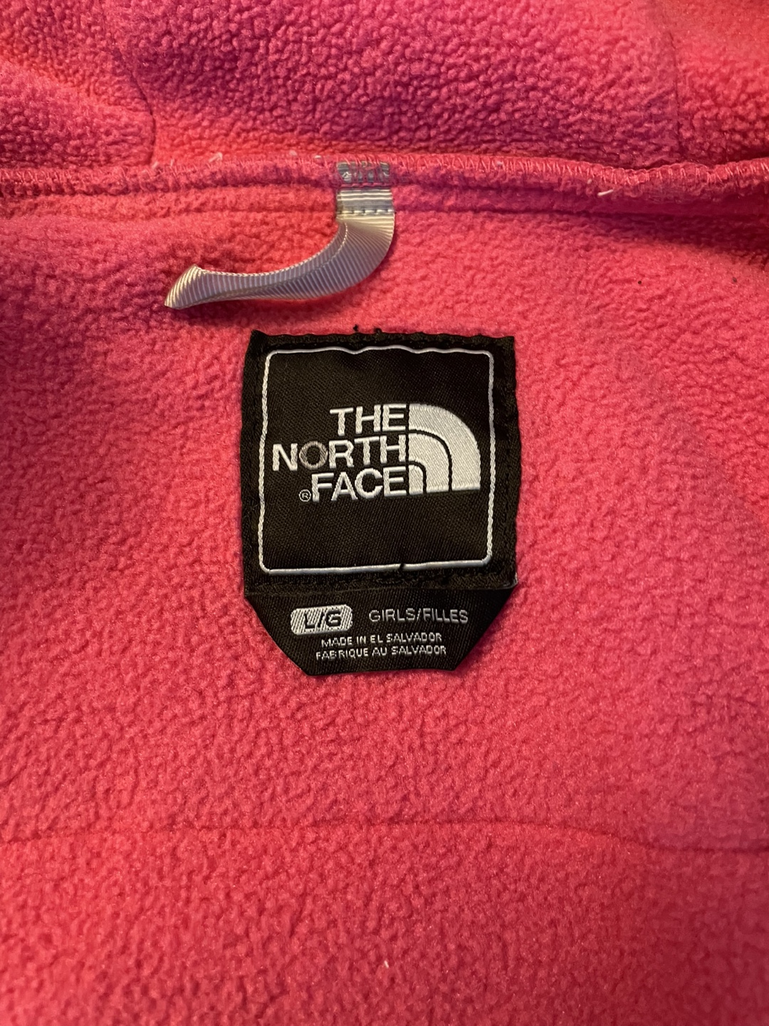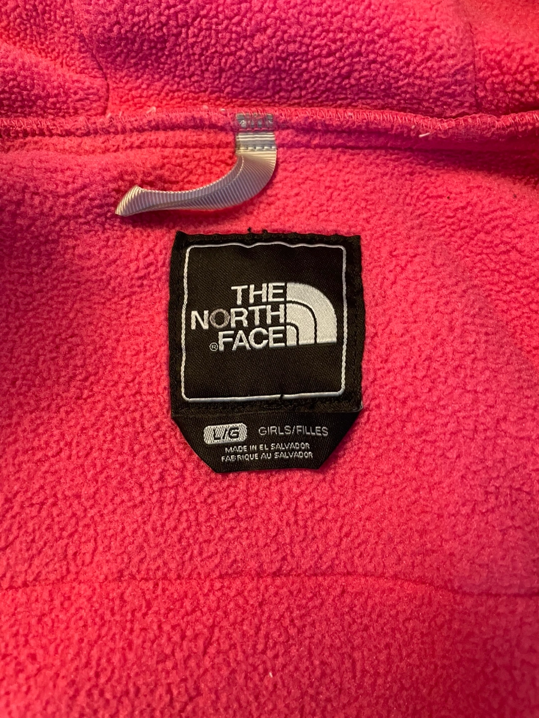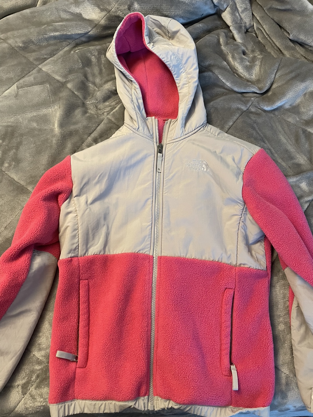Pink and grey colour-blocked fleece jacket. Zip-up front. Hoodie. Can fit size small for adults.