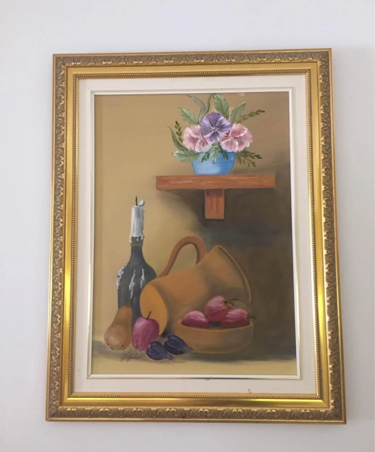Lovely still life painting, features fruit, wine bottle and flowers. Gold-coloured frame. Canvas artwork. Large painting suitable for kitchen area