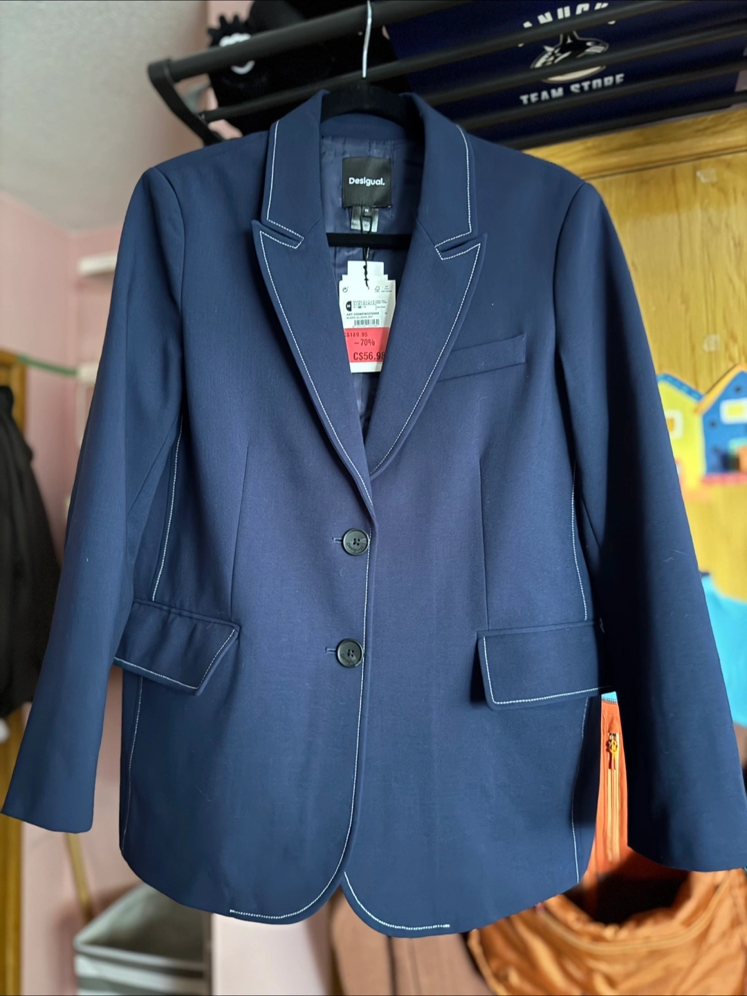 Navy blue blazer. Features white contrast stitching.