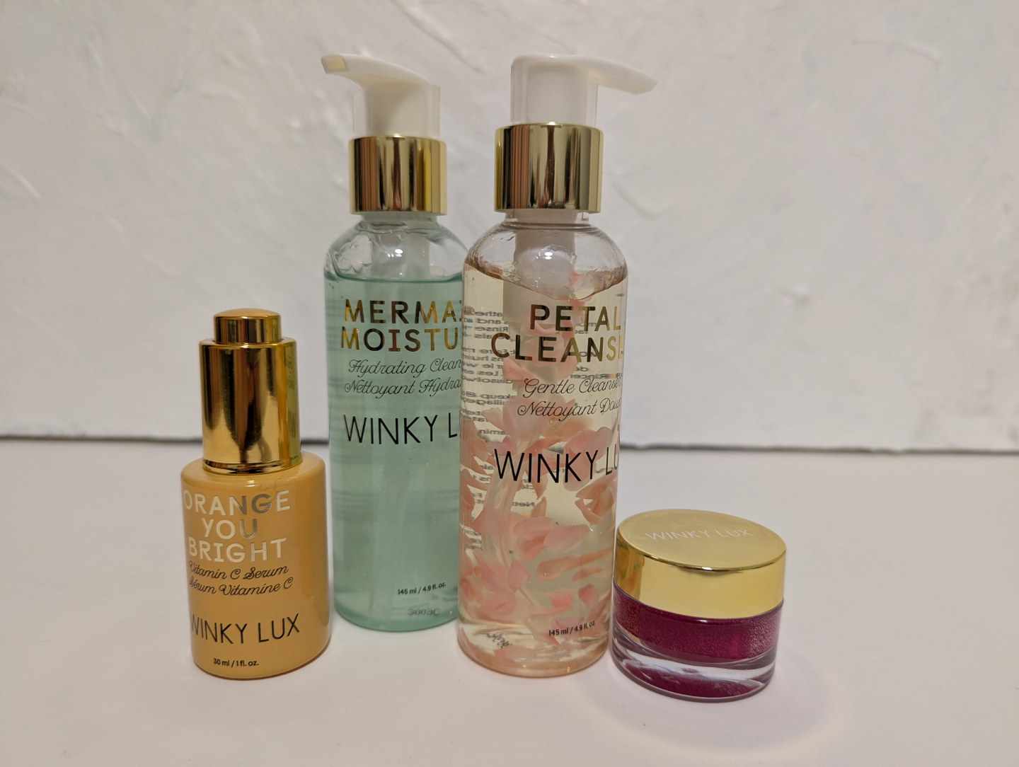Four-piece skincare set includes: Mermaid Moisture hydrating cleanser, Petal Cleanse gentle cleanser, Orange You Bright vitamin C serum, and a small jar of lip product. All products are Winky Lux.