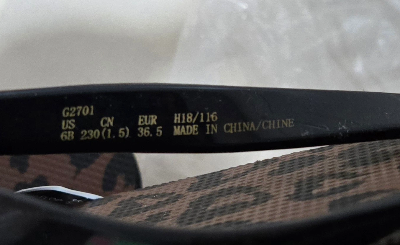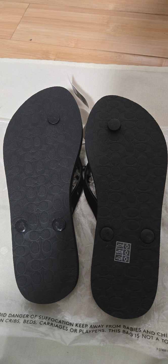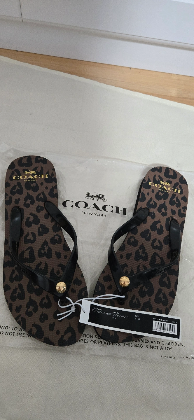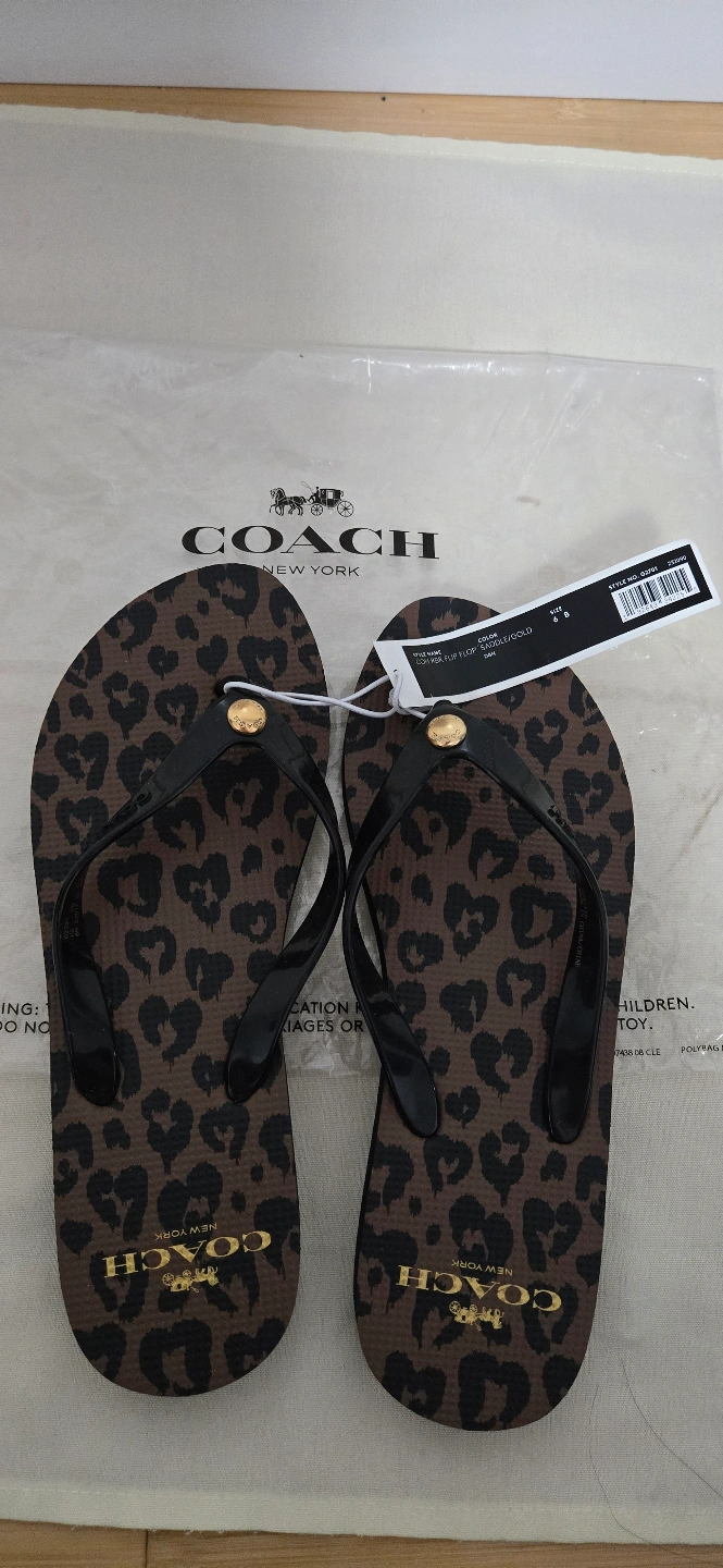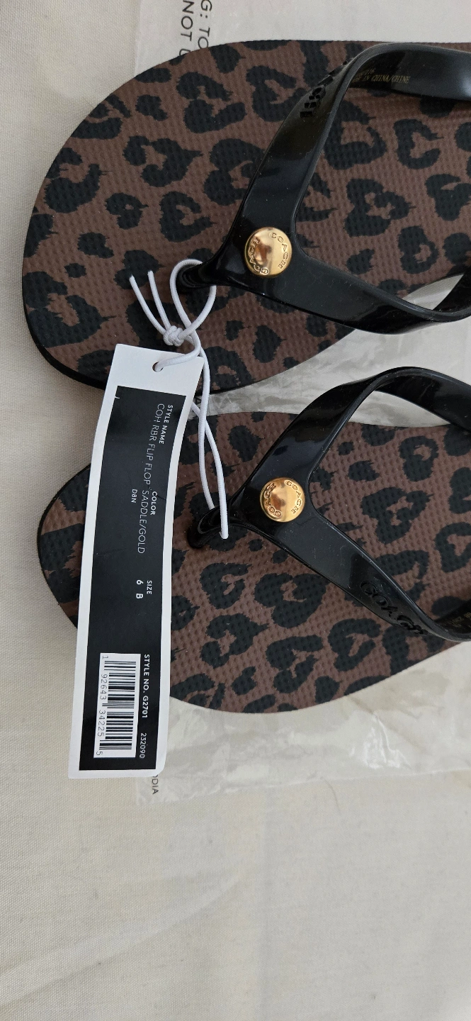 Women's Coach New York flip flops. Size 6B. Leopard print. Black straps. Gold Coach logo accents. New with tags.