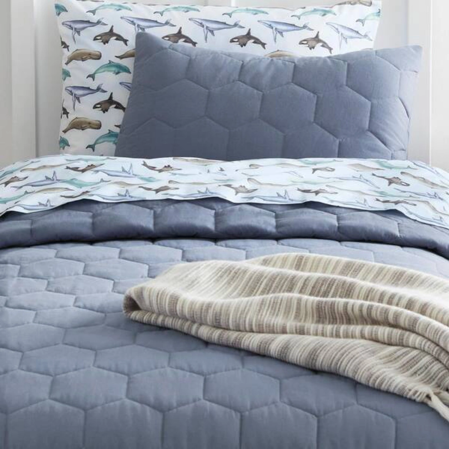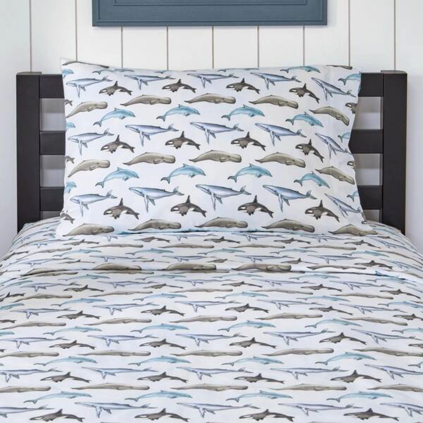 87This twin cotton sheet set includes: (1) 66 in. W x 96 in. L flat sheet, (1) 39 in. W x 75 in. L x 12 in. D fitted sheet, and (1) 20 in. W x 30 in. L standard pillowcase Fitted sheet fits mattresses up to 12 in. deep Cute, sealife patterned and themed twin sheet set for kids 100% cotton