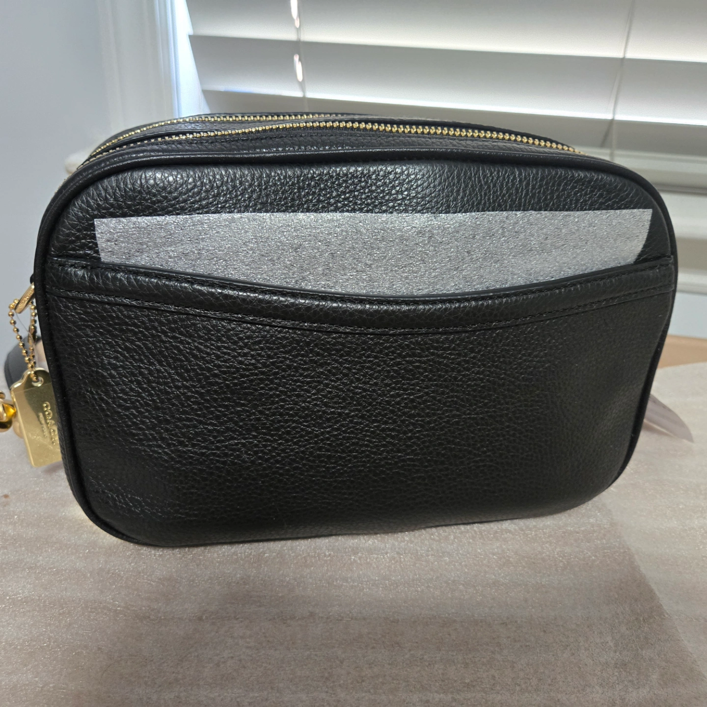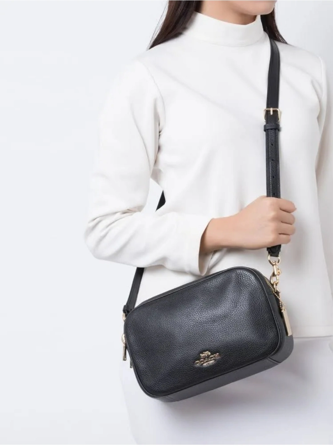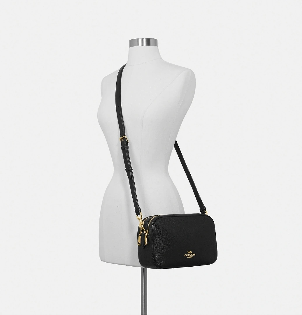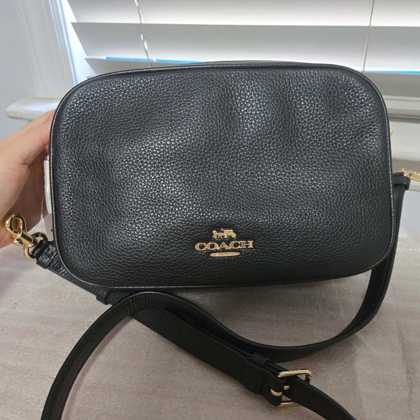 Black pebbled leather crossbody bag. Adjustable strap. Gold-tone hardware. Top zip closure. Coach logo. Excellent condition.