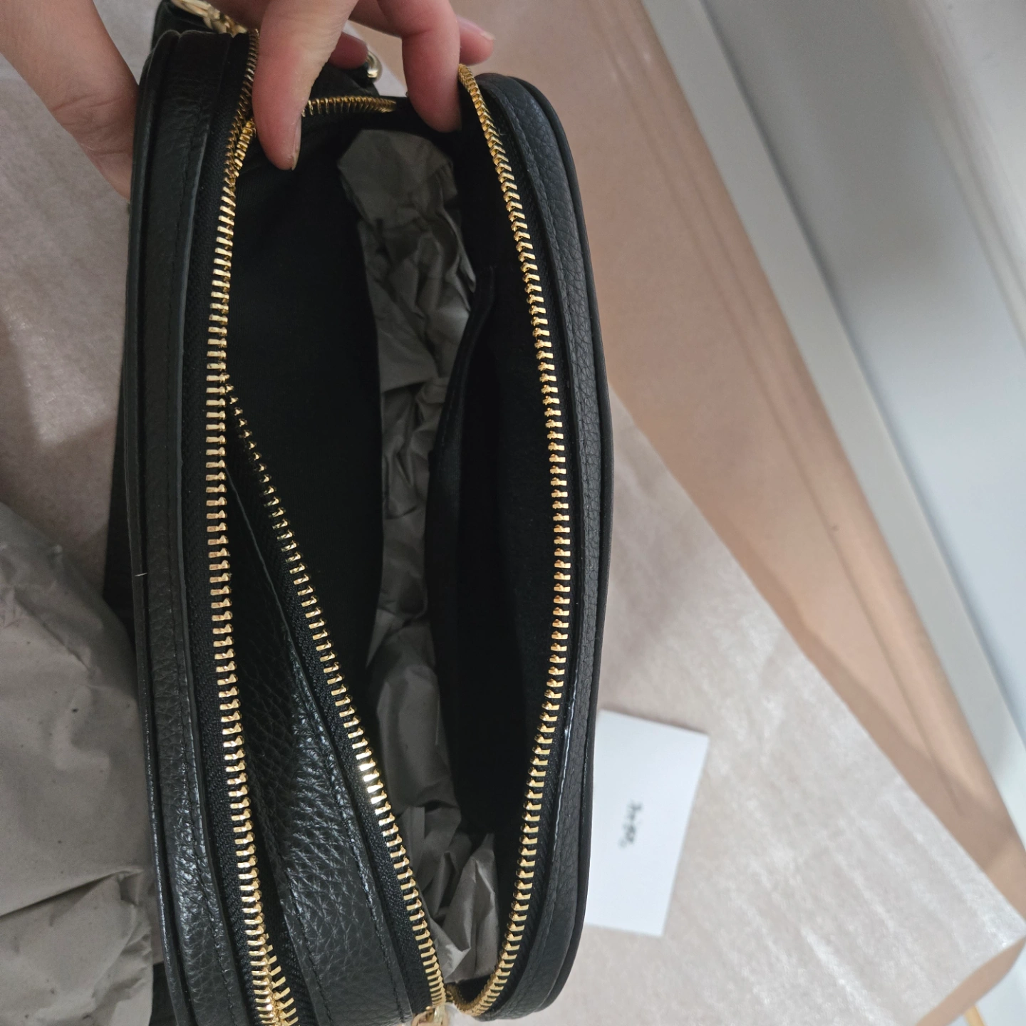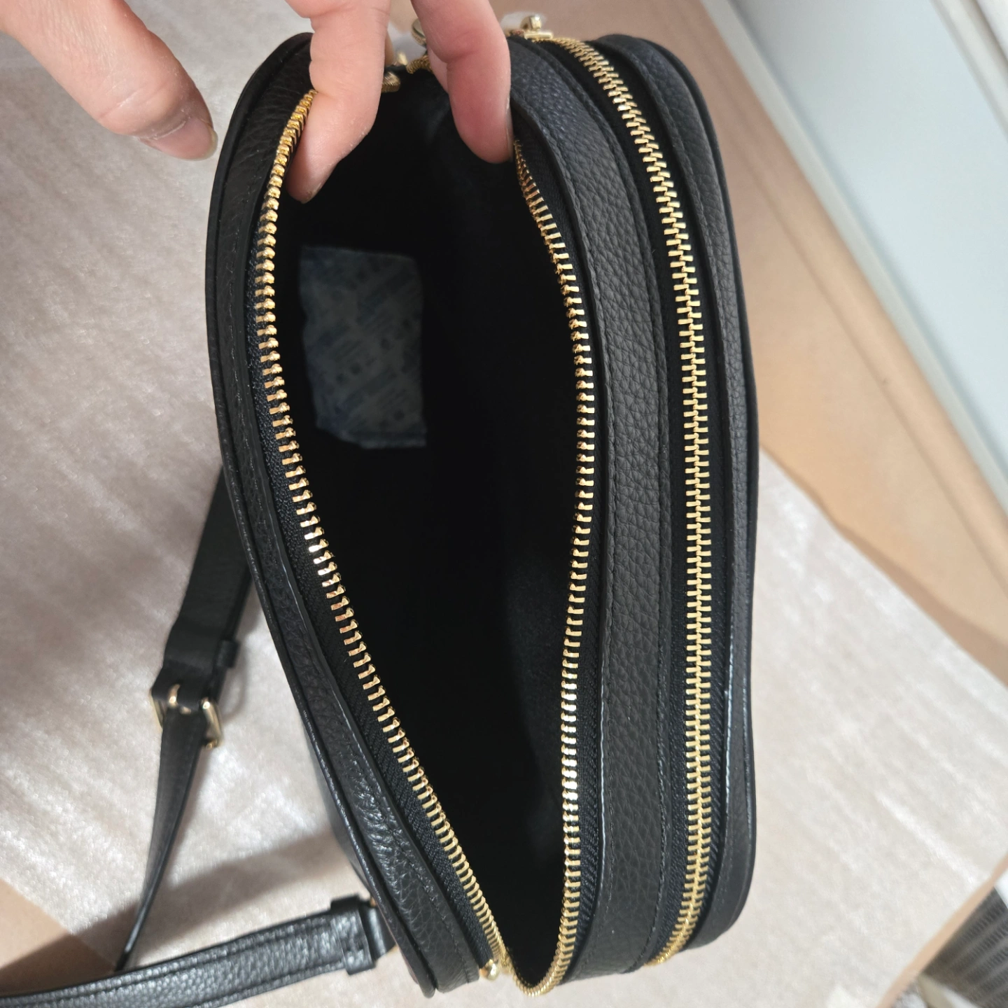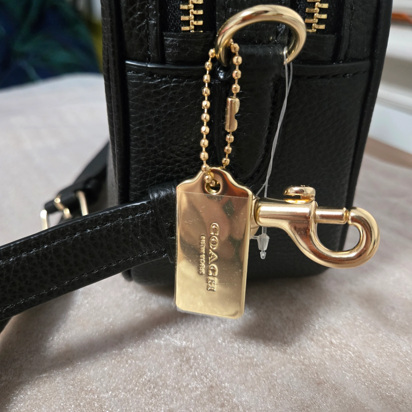 Black pebbled leather crossbody bag. Adjustable strap. Gold-tone hardware. Top zip closure. Coach logo. Excellent condition.