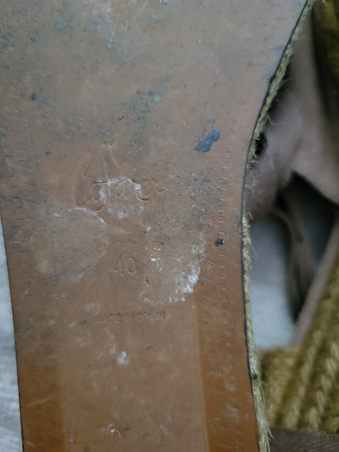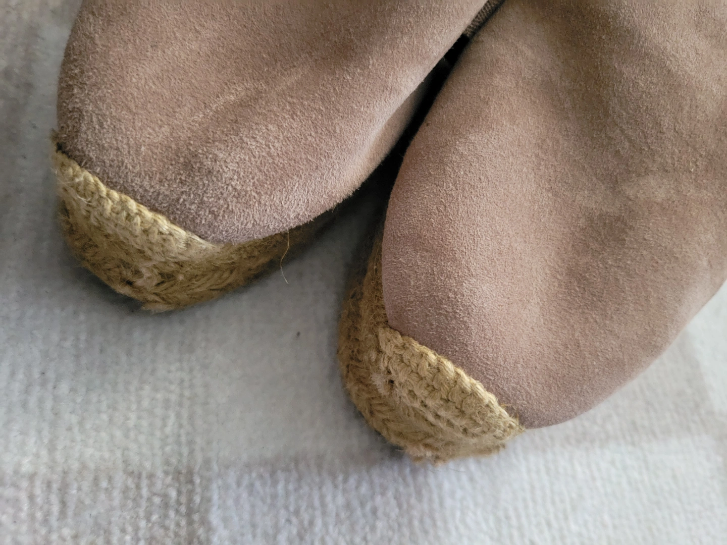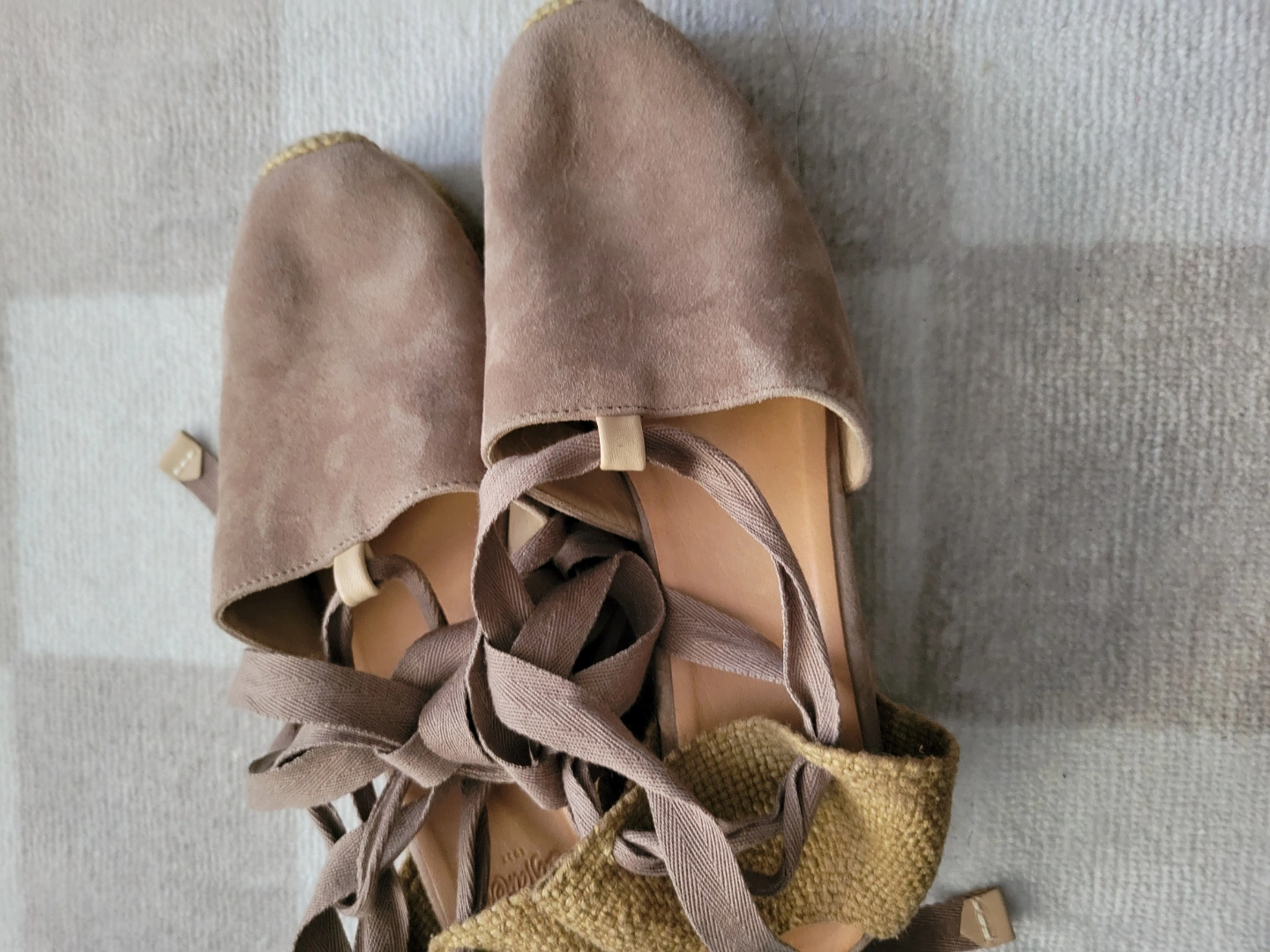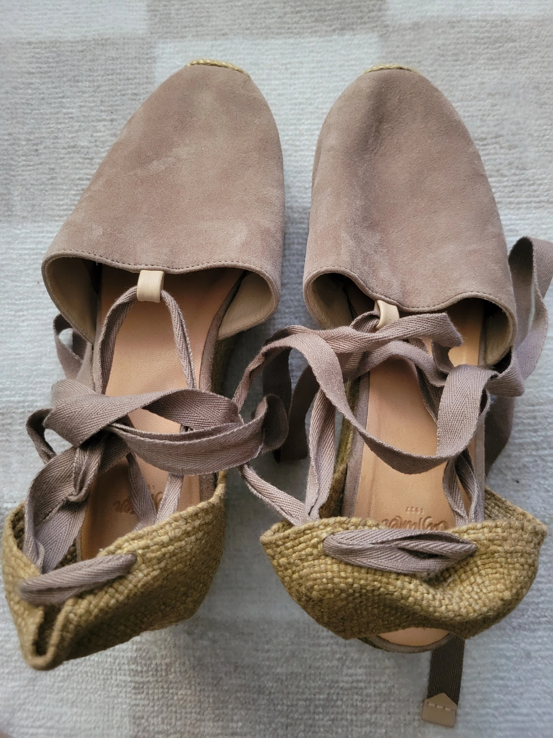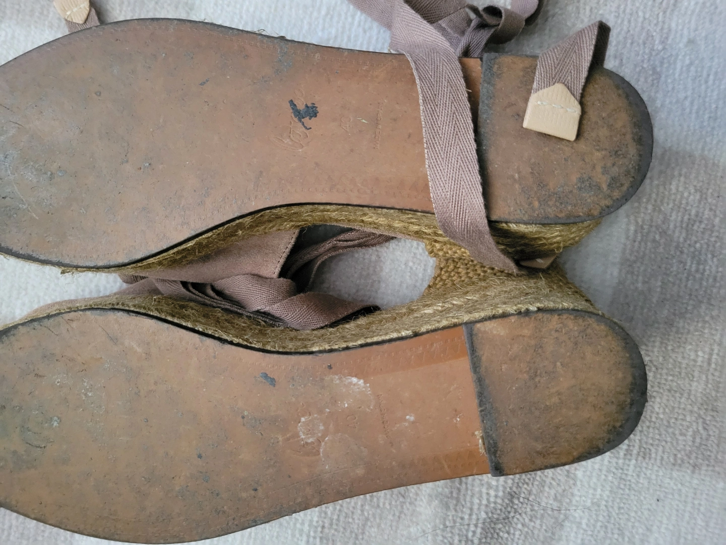 Brown suede espadrille wedges. Lace-up design. Jute platform and sole. Pre-owned.