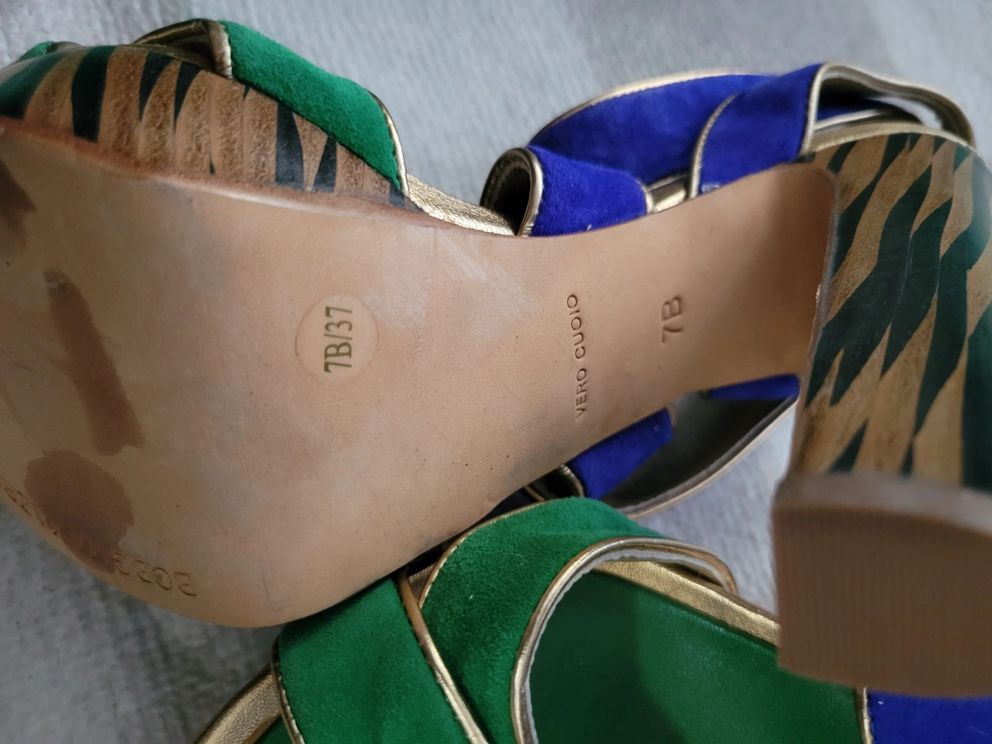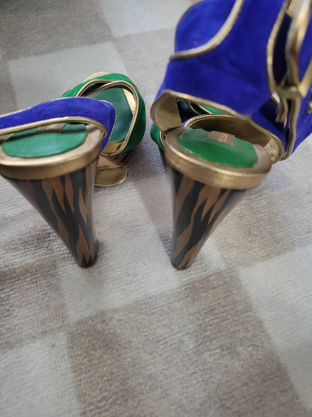 Stunning BCBGMAXAZRIA platform sandals. Green and blue suede upper. Gold accents. Zebra print heels. Size 7B.