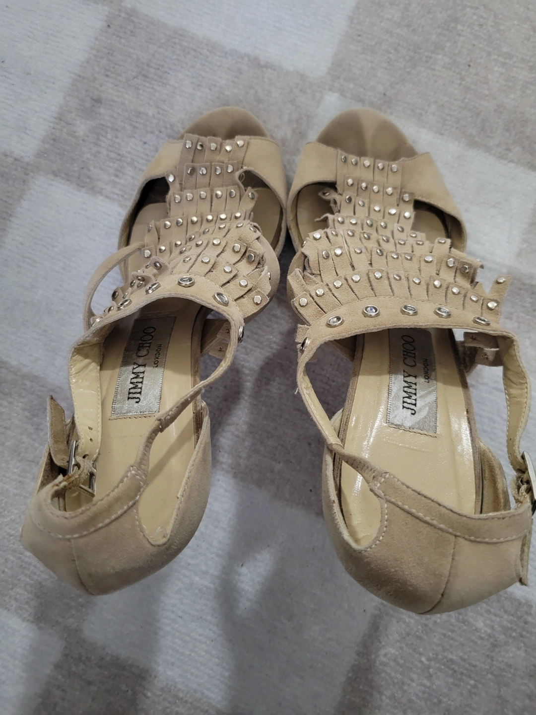 Beautiful beige suede Jimmy Choo heels. Fringe detail and studded accents. Size 38. Made in Italy.