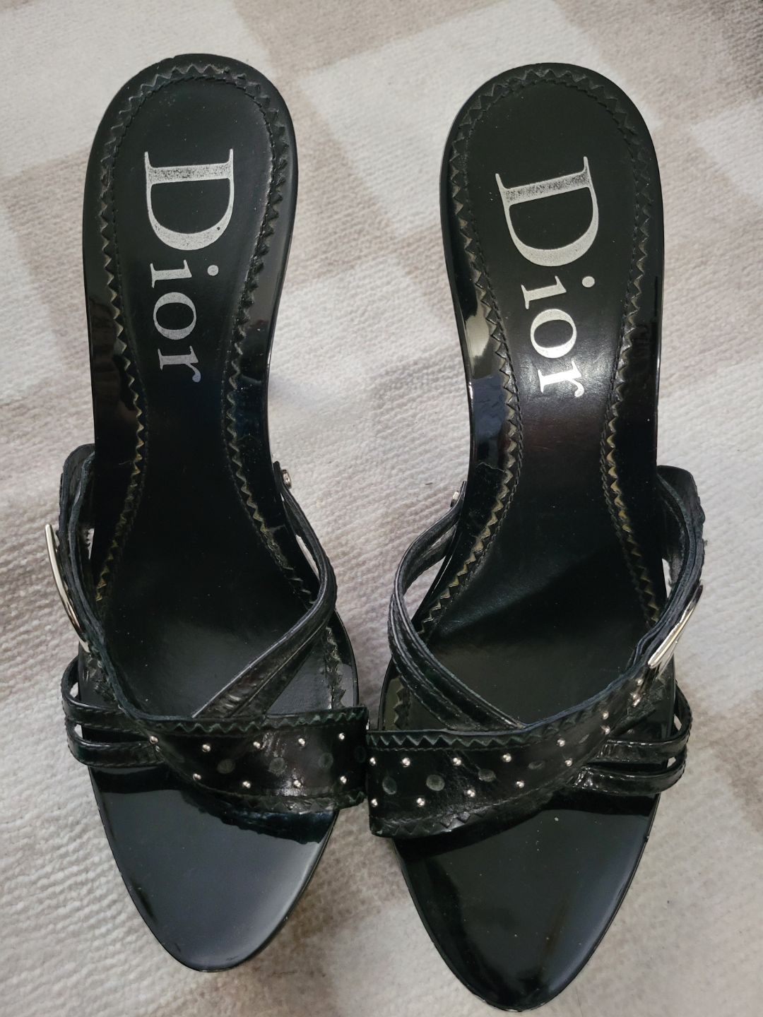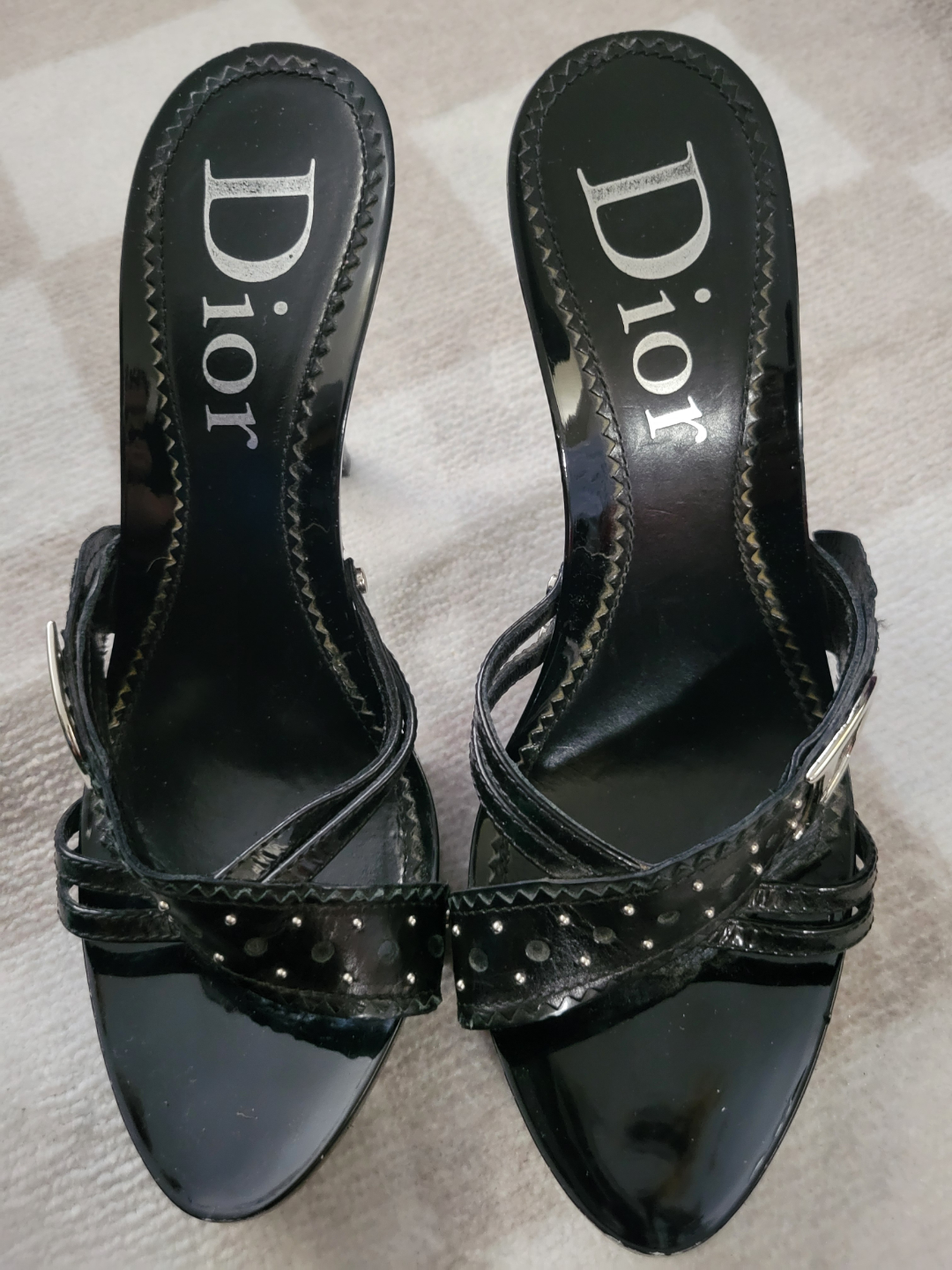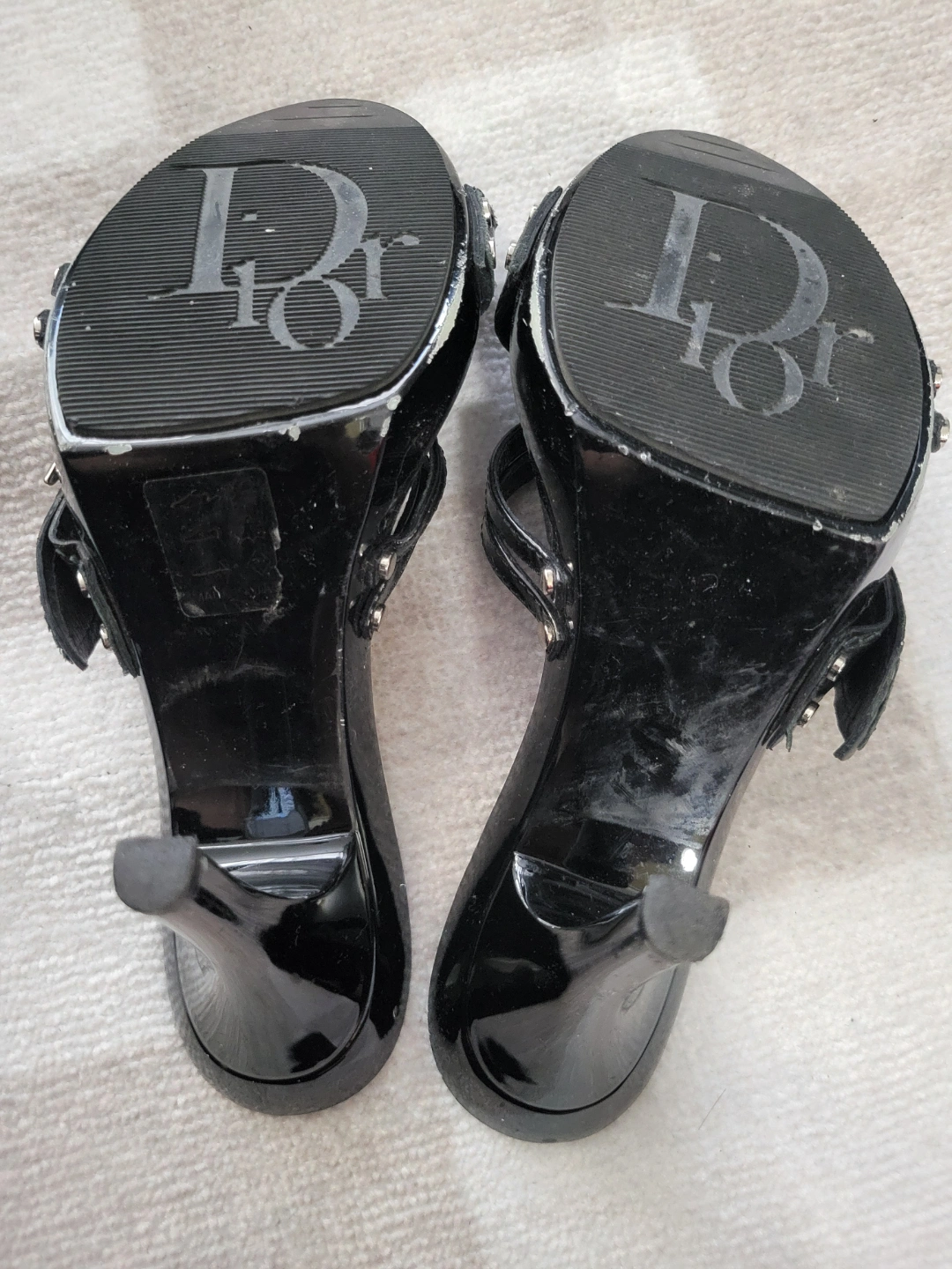 Black patent leather heels. Cross-strap design. Silver buckle accents. Studded detailing. High heels. Dior branding visible on insole and outsole.