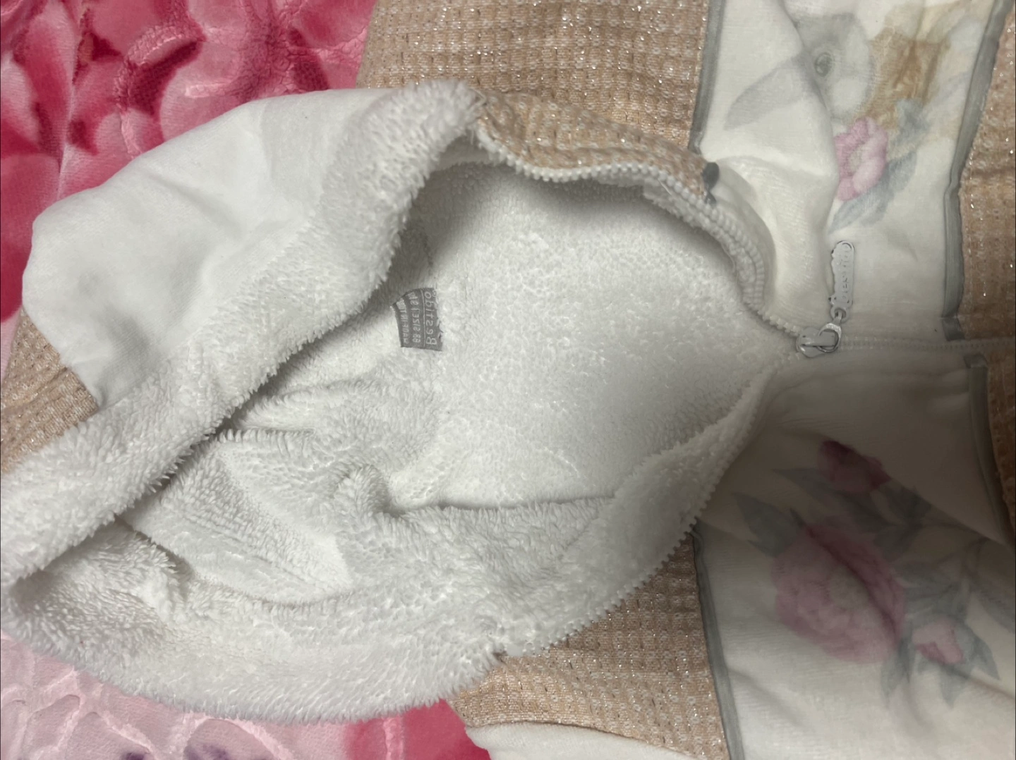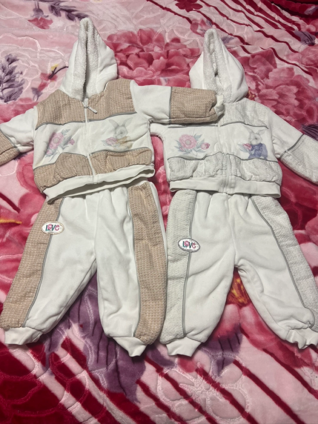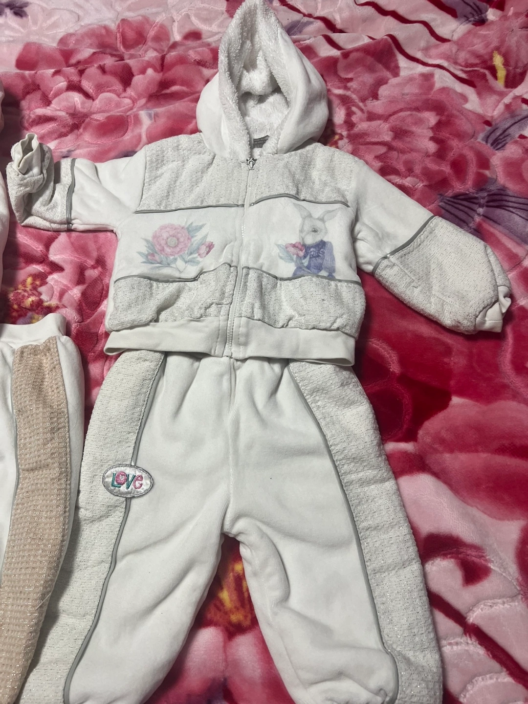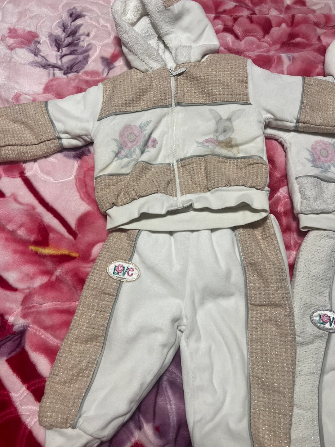 Adorable two-piece baby girl outfits. Hooded jackets and matching pants. Features a soft fleece lining. Cute bunny and floral designs. Size 12 months.