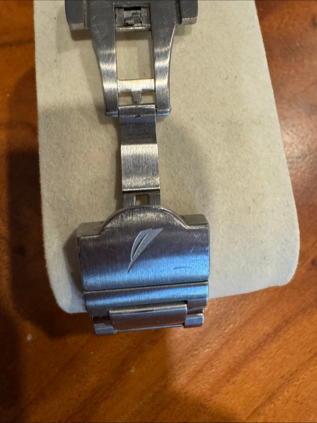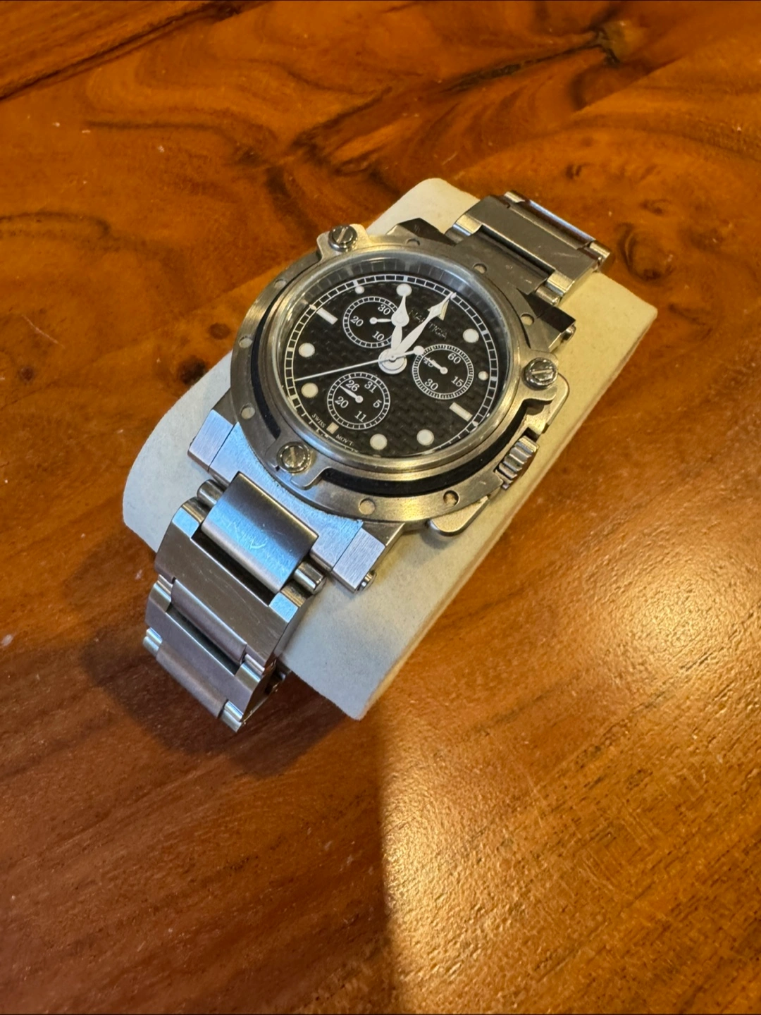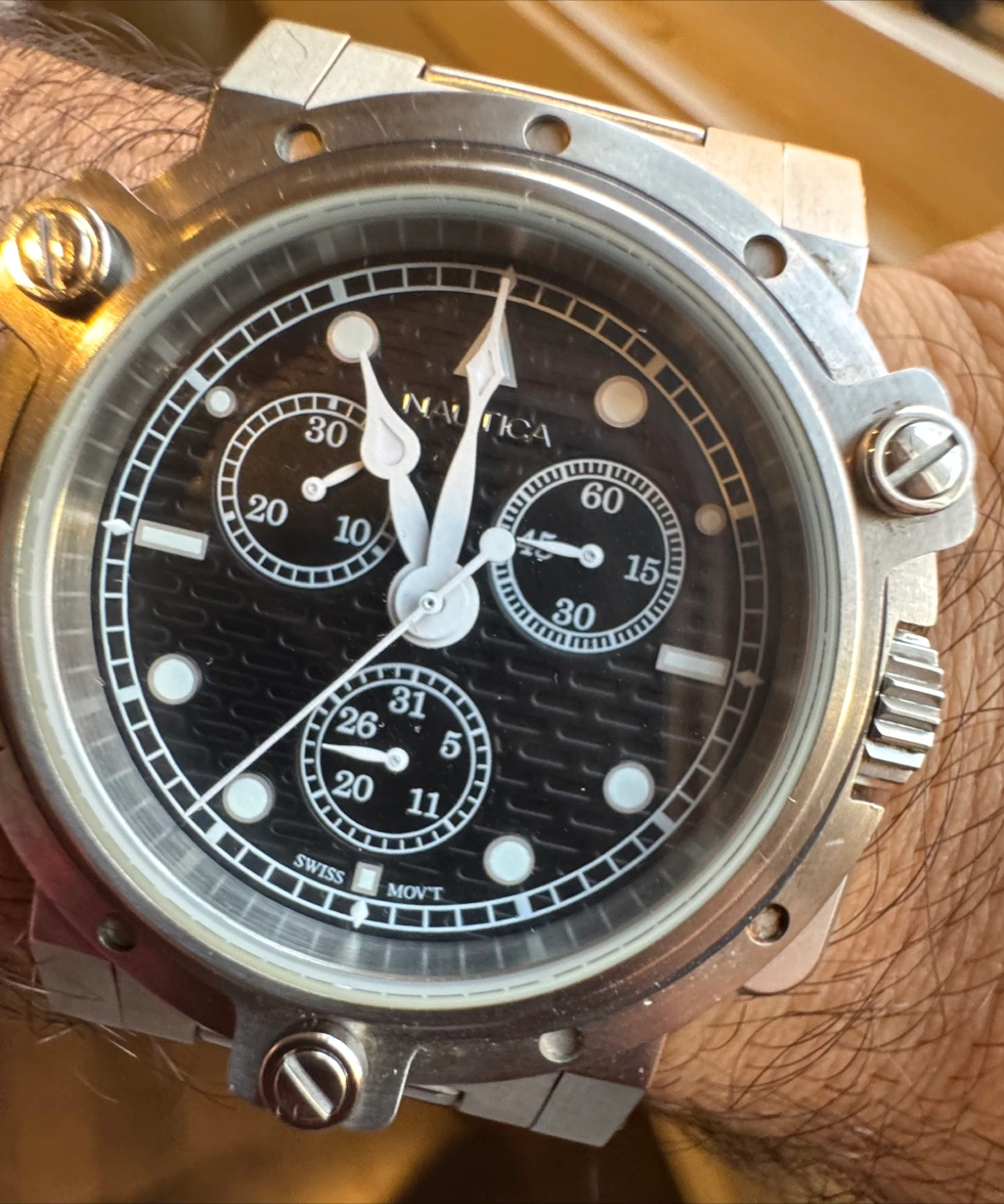 Nautica men's chronograph watch. Stainless steel band and case. Black face. Swiss movement. Pre-owned.