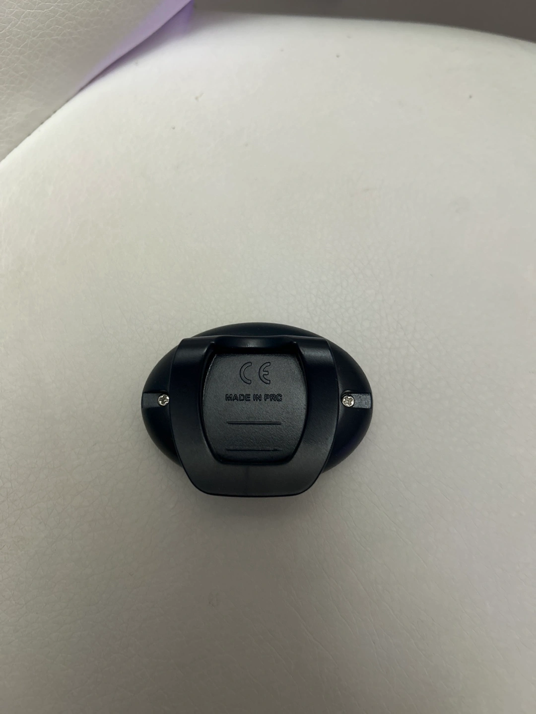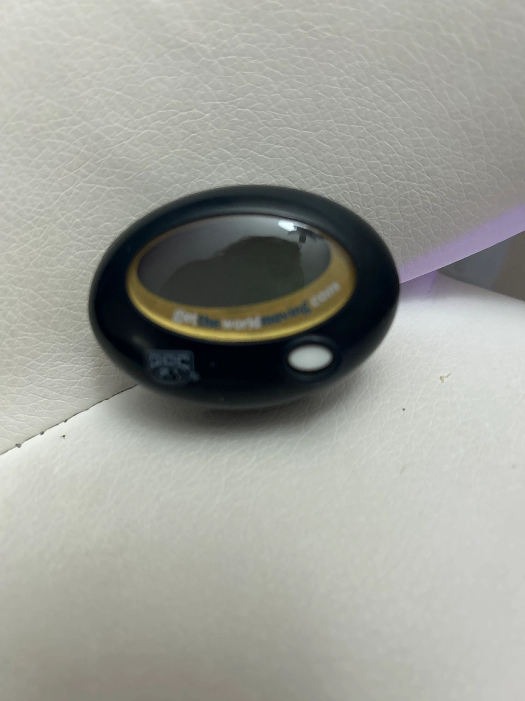 Small black pedometer. Clip-on design. Digital display. Made in PRC.