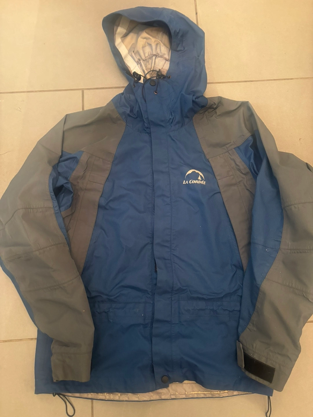 Men's La Cordée Gore-Tex rain jacket. Blue and grey colour block design. Features a hood and zipper closure. Water resistant and breathable. Excellent for outdoor activities.