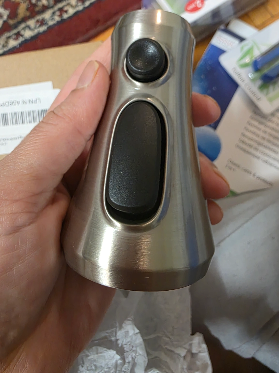 New faucet sprayer head replacement part. Stainless steel finish. Features two buttons for spray control. Comes in original packaging.