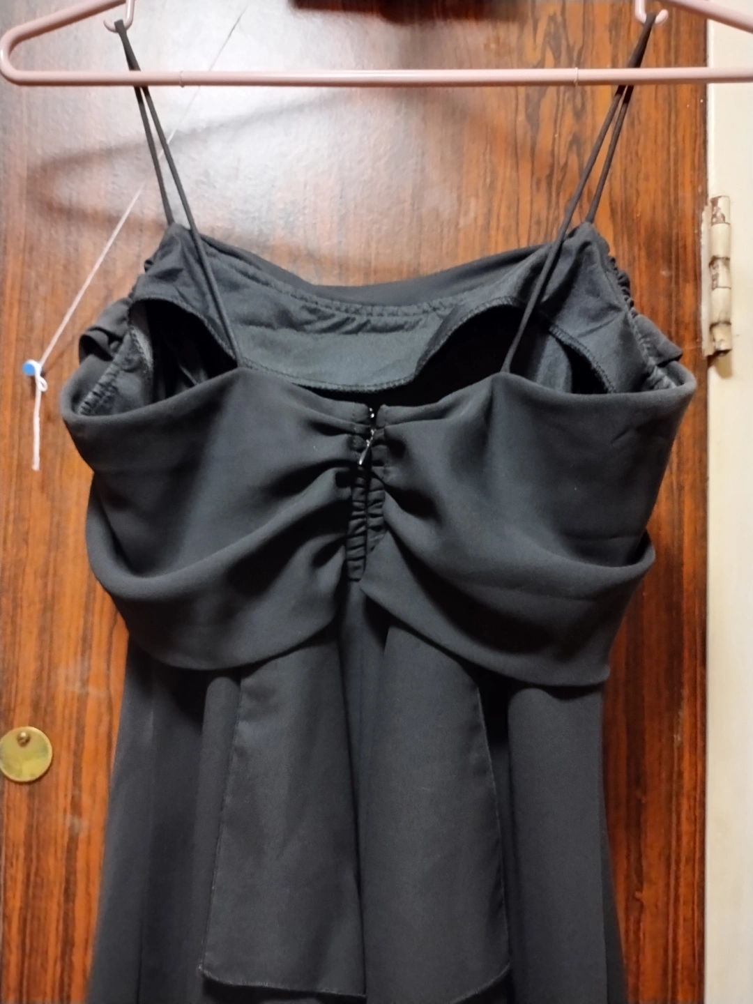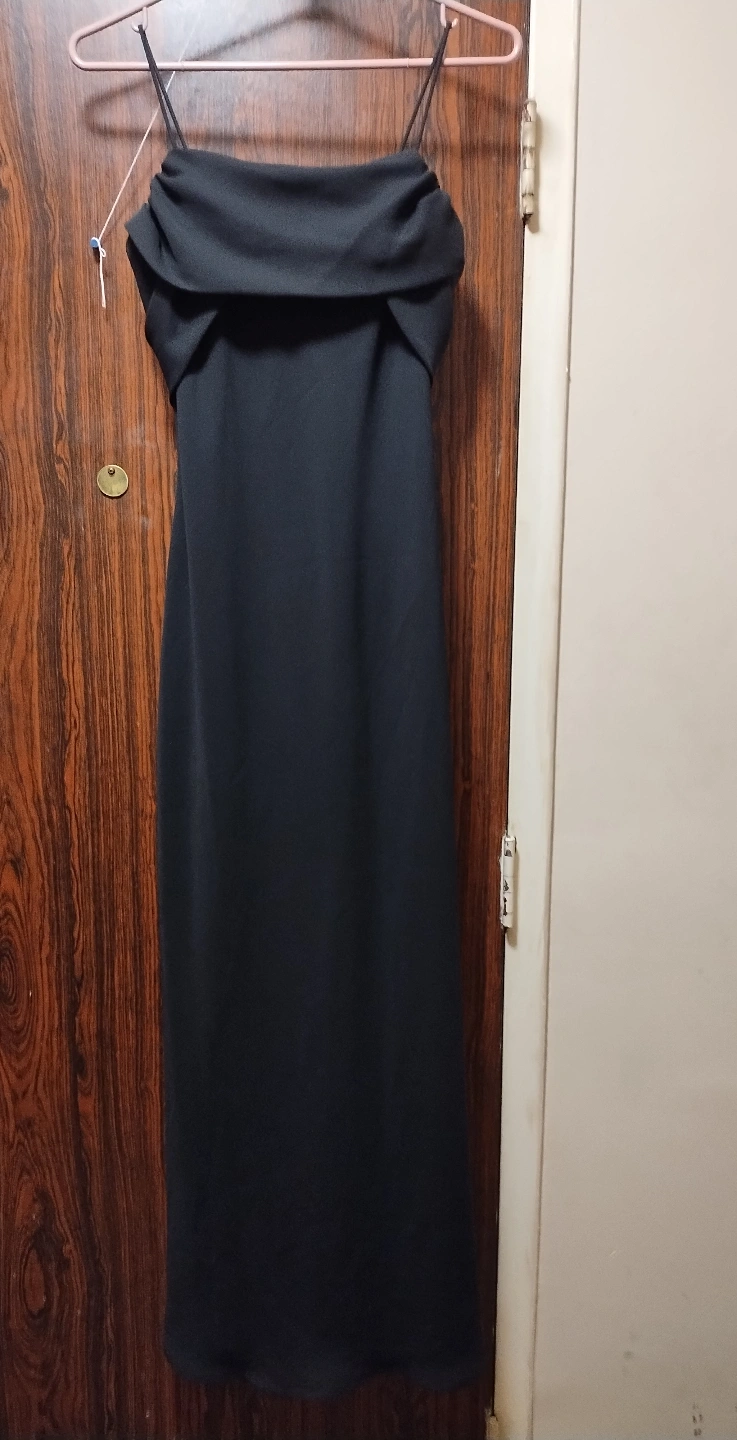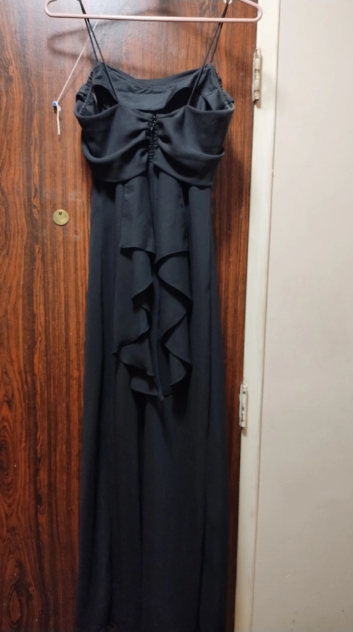 Elegant black formal dress. Spaghetti straps with zipper closure on back. Unique ruffled detailing in the back. Size 5. Only worn once many years ago, does have a bit of fading at underarm area, but otherwise is perfect.