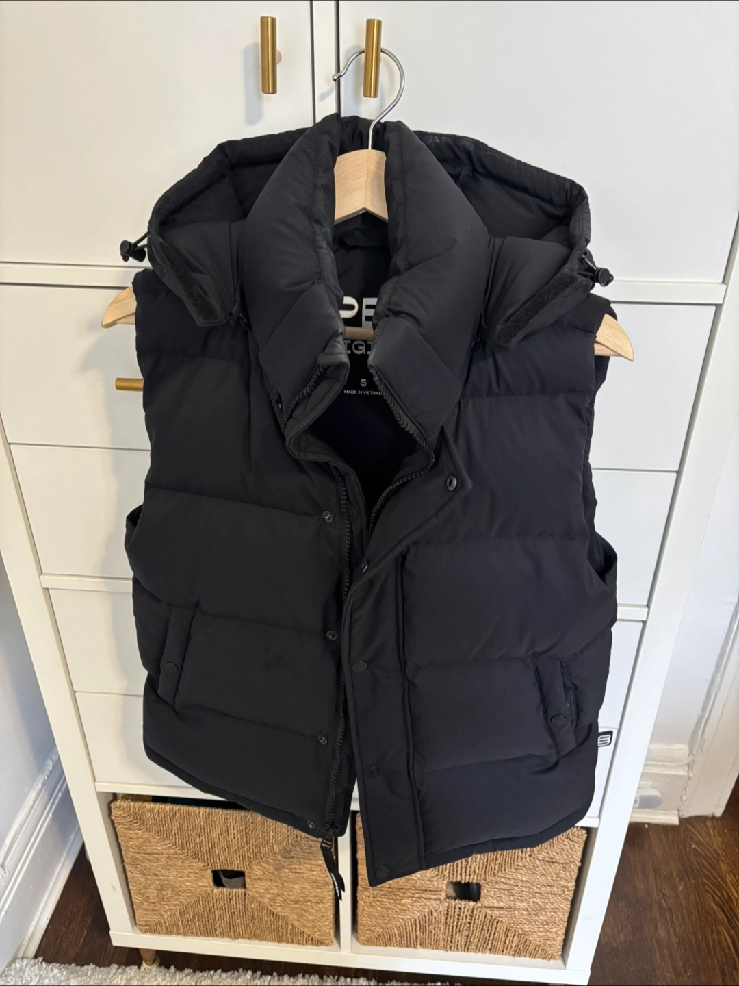 Selling my TNA SuperPuff Vest (black, size Small) as I’m downsizing for a move to a warmer country.