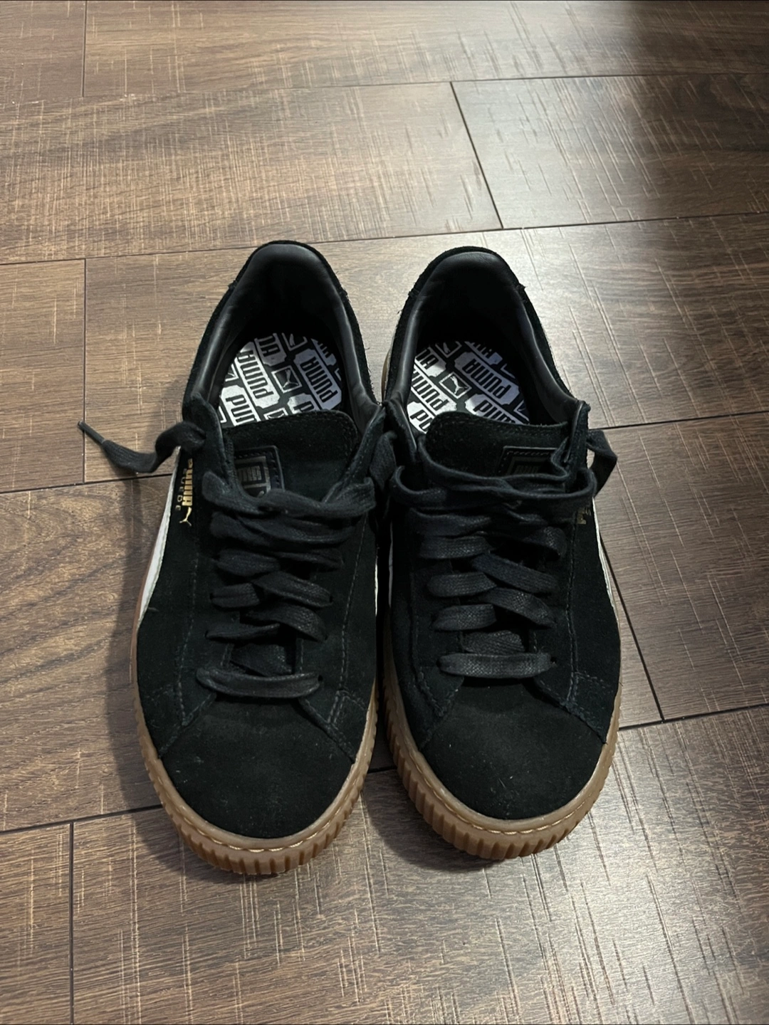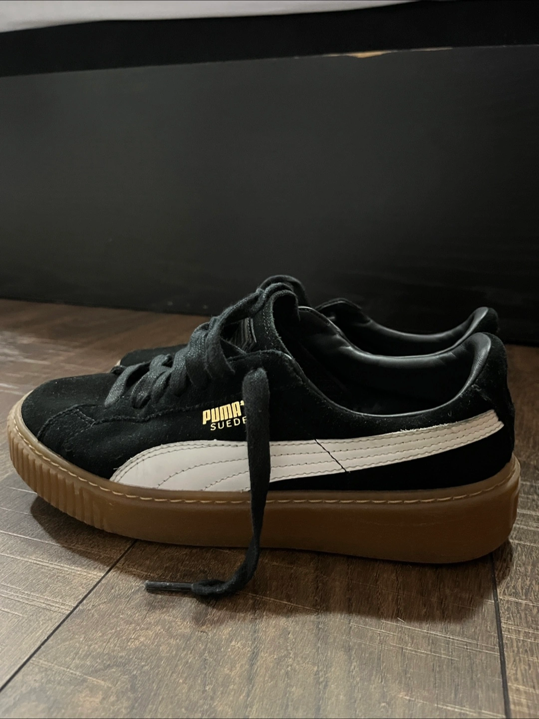 Black suede Puma Suede Platform sneakers. Gum sole. Women's size 7.5. Classic style. Pre-owned.
